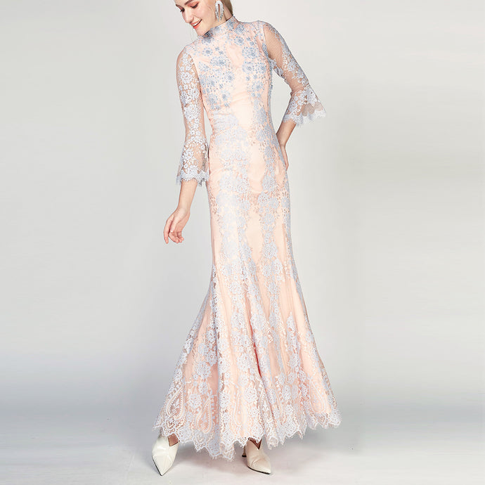 Jeslyn Trumpet Sleeve Beaded Lace Dress