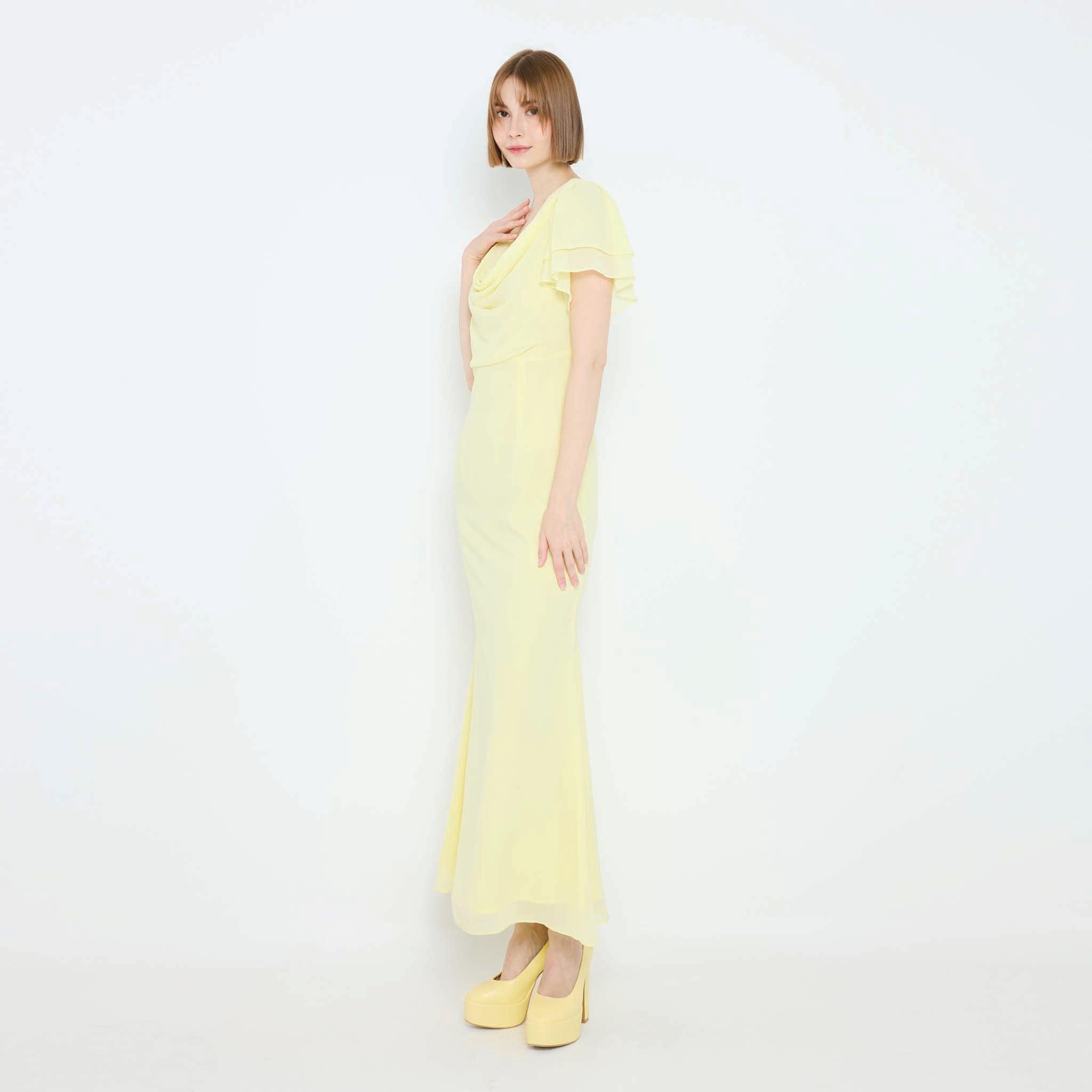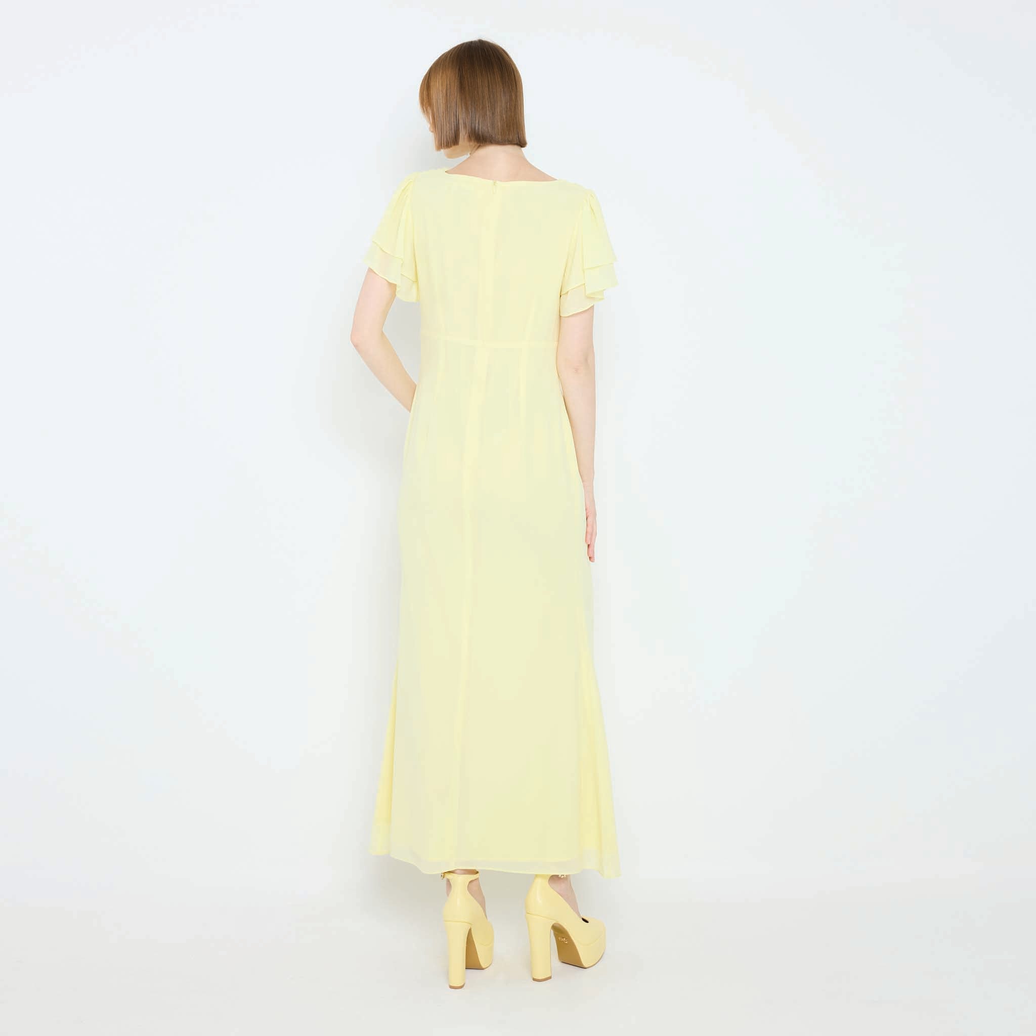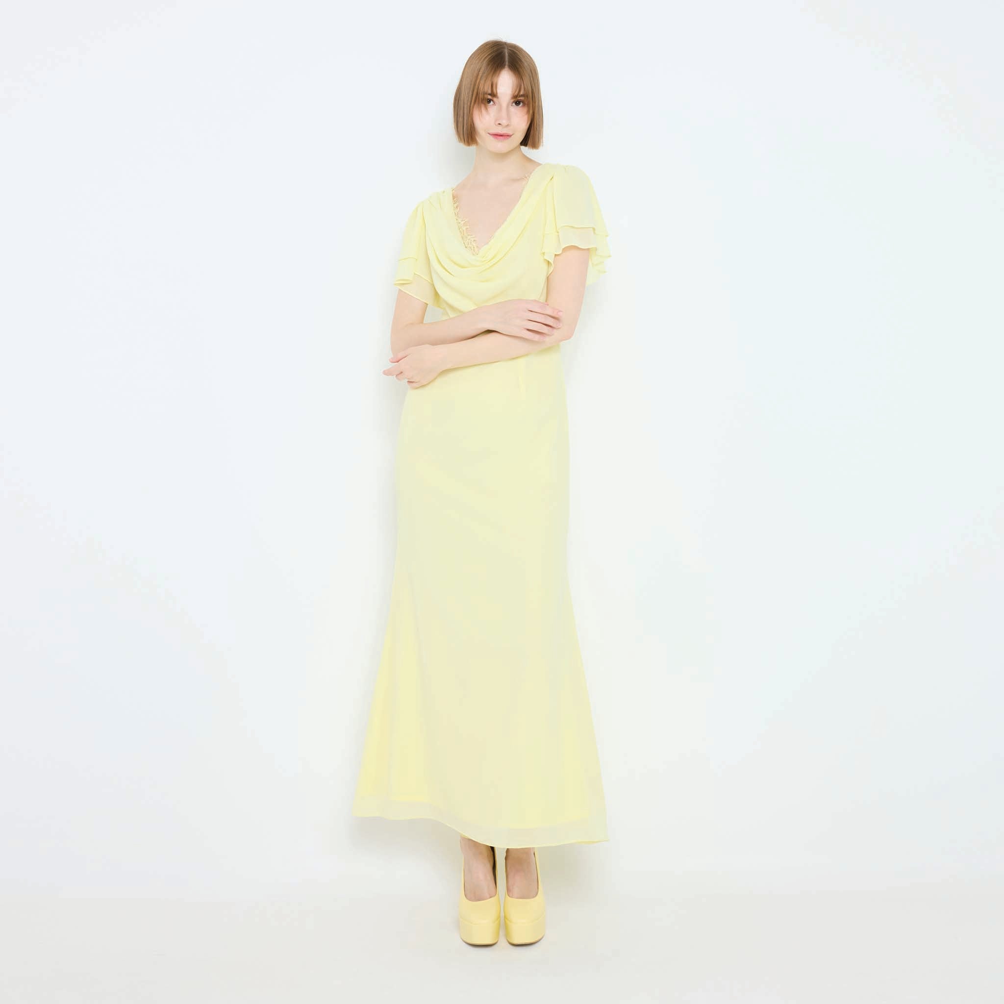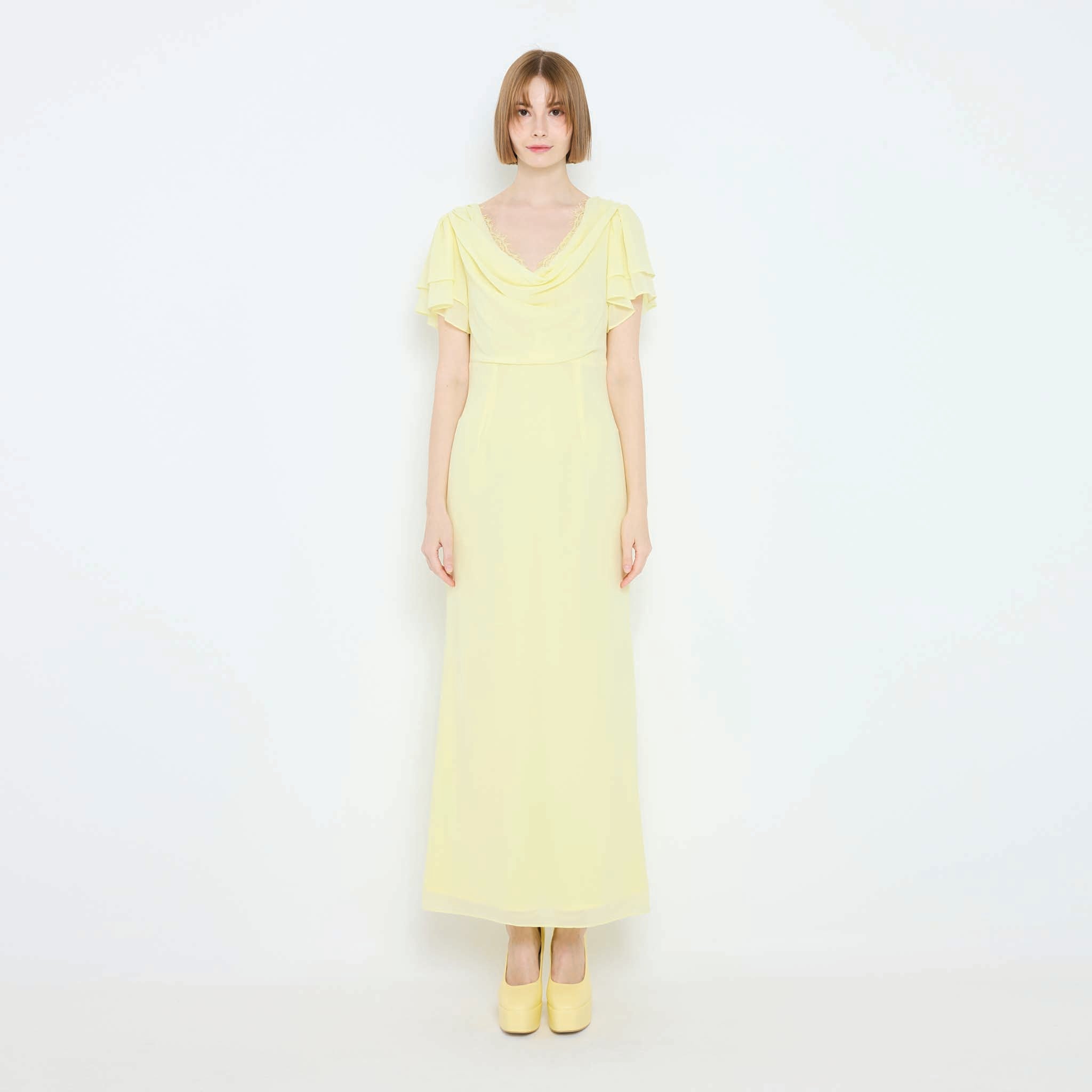 Soft chiffon dress with lace-trimmed draped neckline, airy bell sleeves, and a fluid full-length cut. Lined for comfort with an invisible back zip.