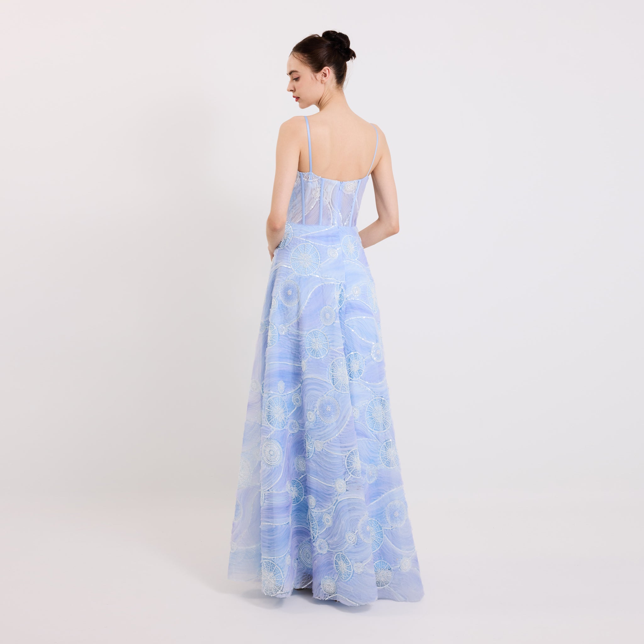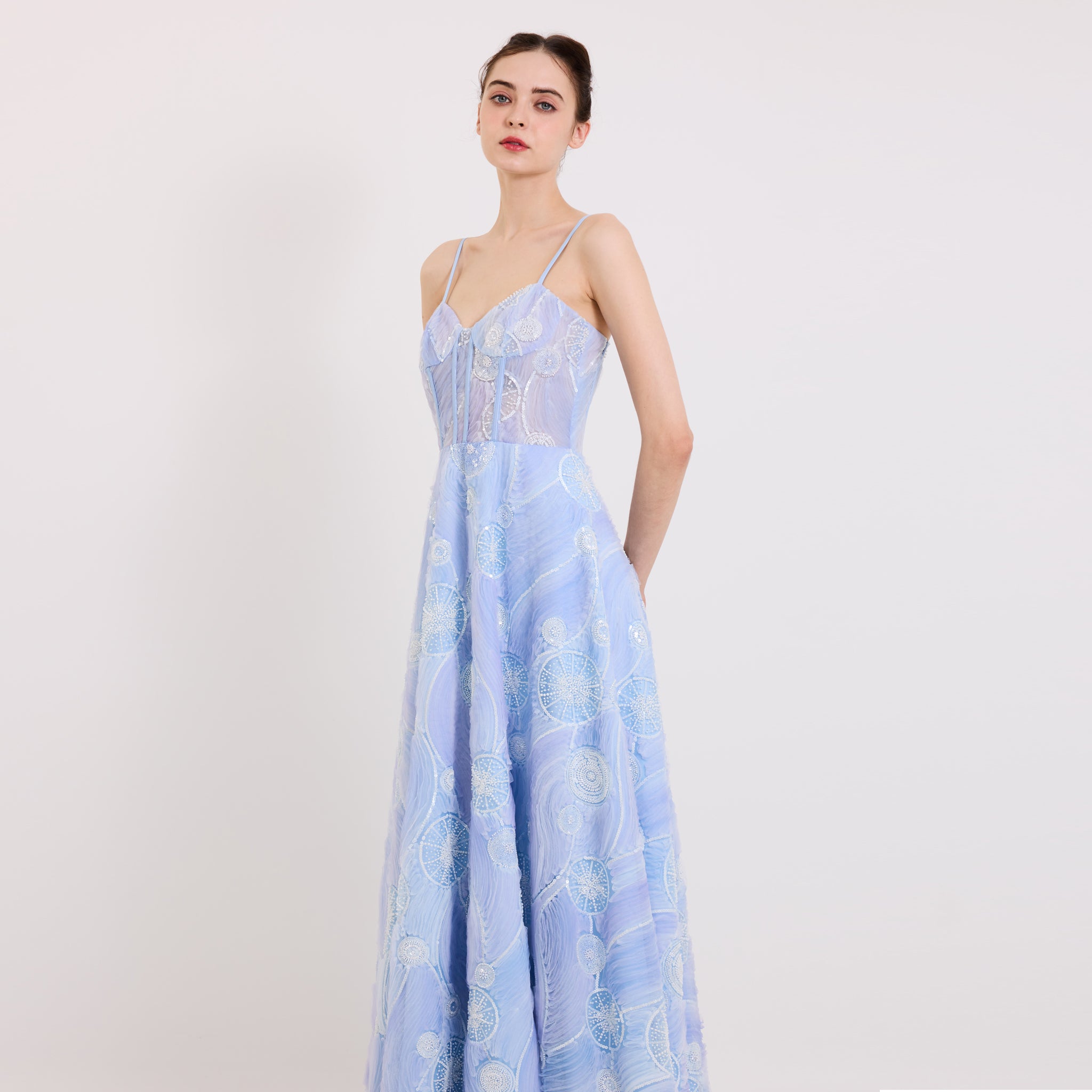 For a graceful silhouette, this piece has a fitted corset bodice that flows into a wide skirt and finished with slender satin straps - perfect for evening soirées or special occasions.