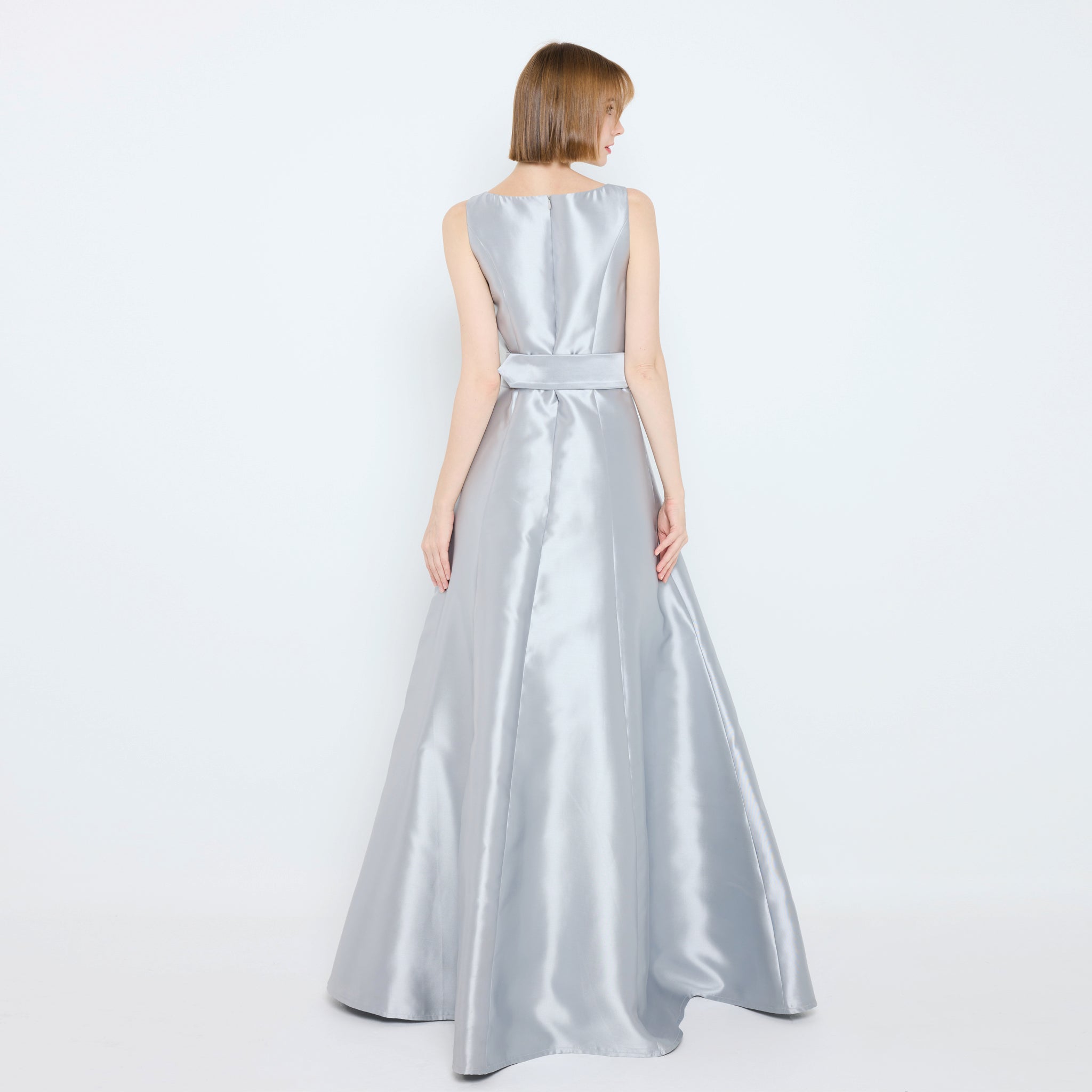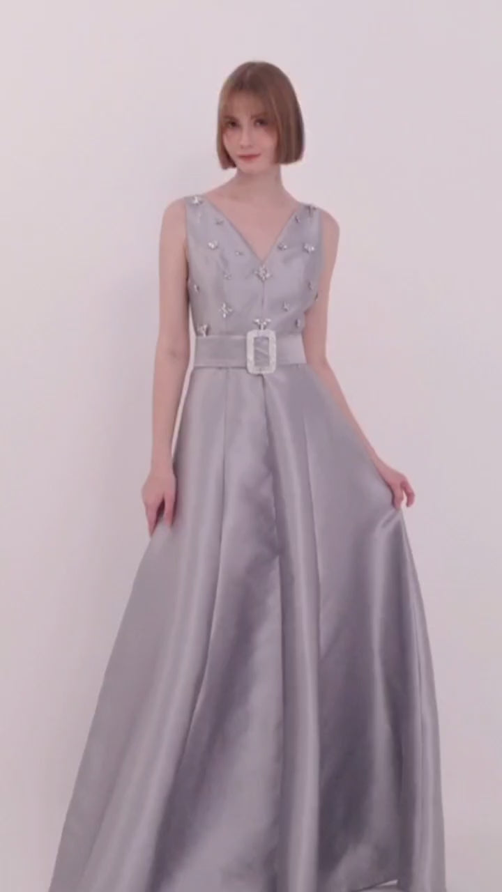 Radiate timeless elegance in this sleeveless satin gown, featuring a V-neckline adorned with delicate embellishments. The fitted bodice flows into a full A-line skirt with a soft sheen, cinched at the waist with a statement buckle belt for a refined silhouette. Perfect for evening galas or special occasions.