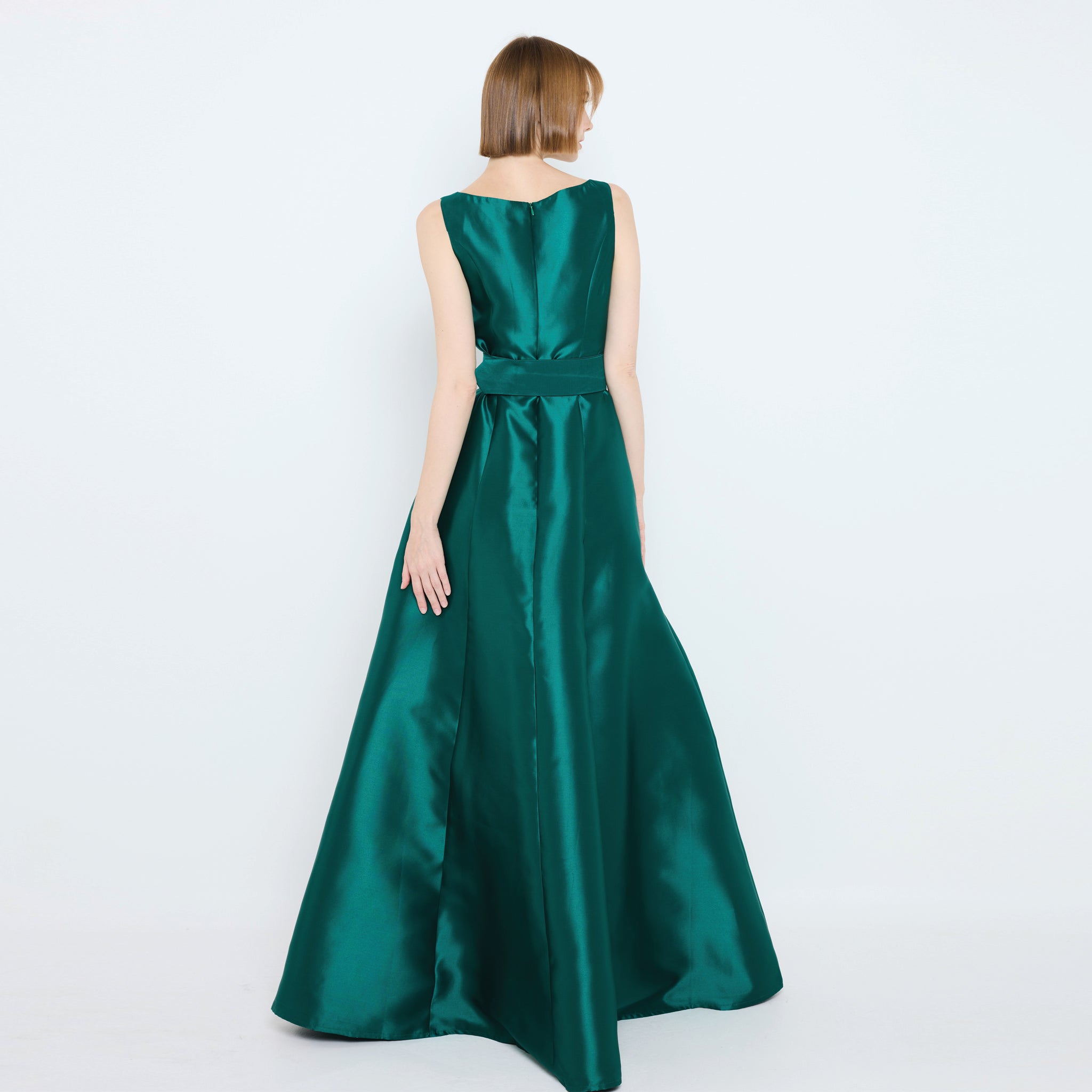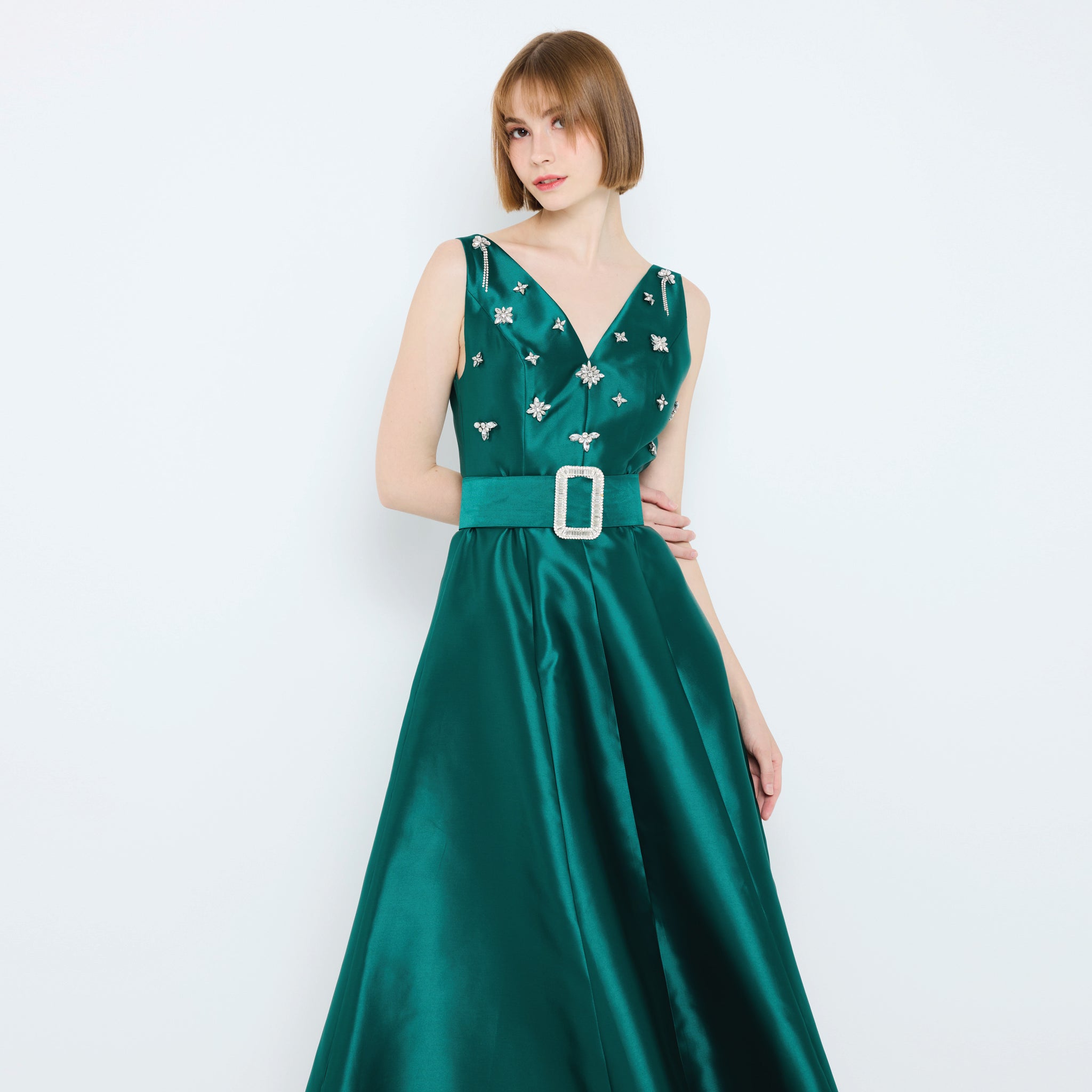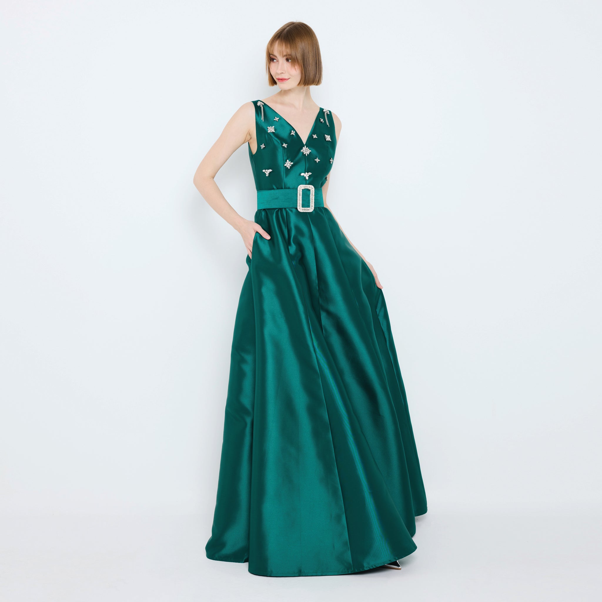 Radiate timeless elegance in this sleeveless satin gown, featuring a V-neckline adorned with delicate embellishments. The fitted bodice flows into a full A-line skirt with a soft sheen, cinched at the waist with a statement buckle belt for a refined silhouette. Perfect for evening galas or special occasions.