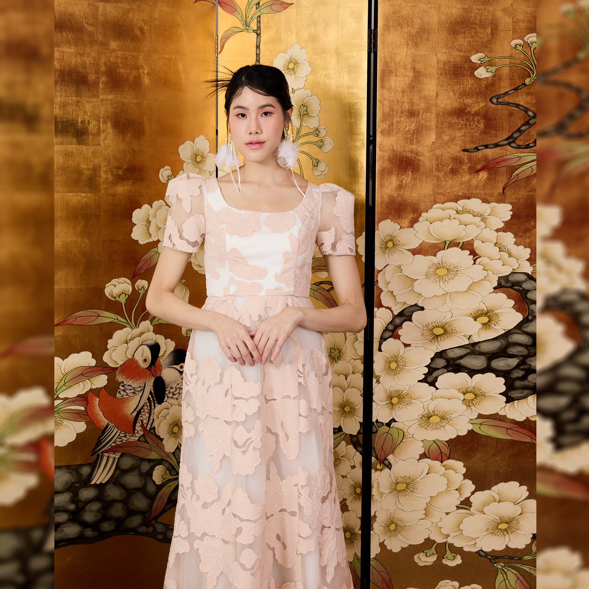 Celebrate the season with the Li Ying Gown, a signature highlight from our Lunar ’26 Collection. Blending heritage with high-fashion, this gown stands out with its unique square-round neckline and voluminous puff sleeves. The ethereal flower collage on tulle mesh lace creates a stunning 3D effect, making this A-line masterpiece the sophisticated choice for the contemporary woman.