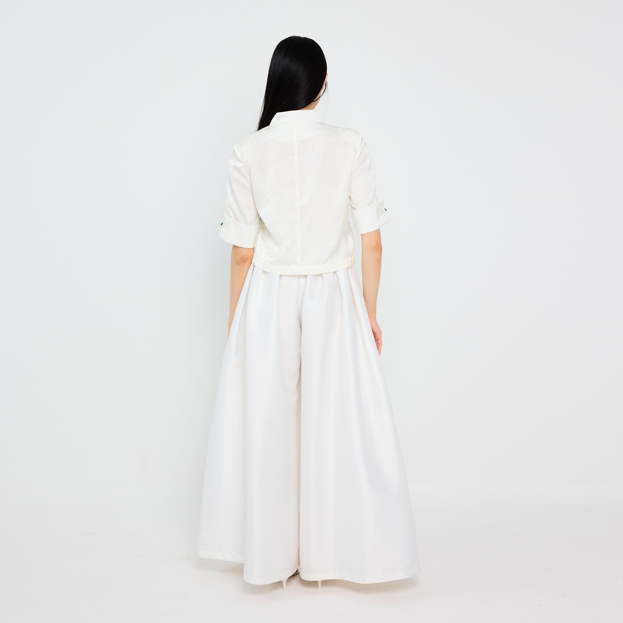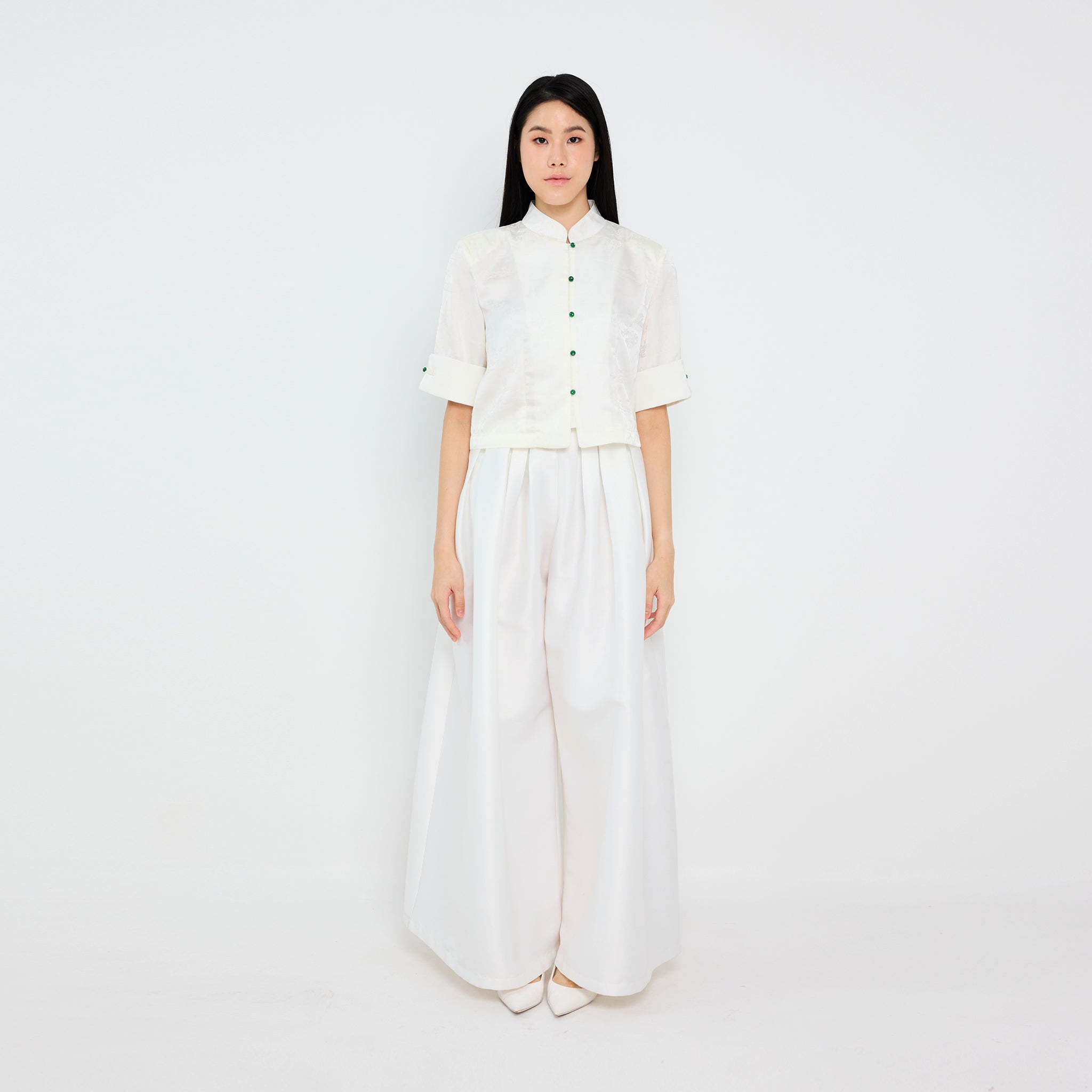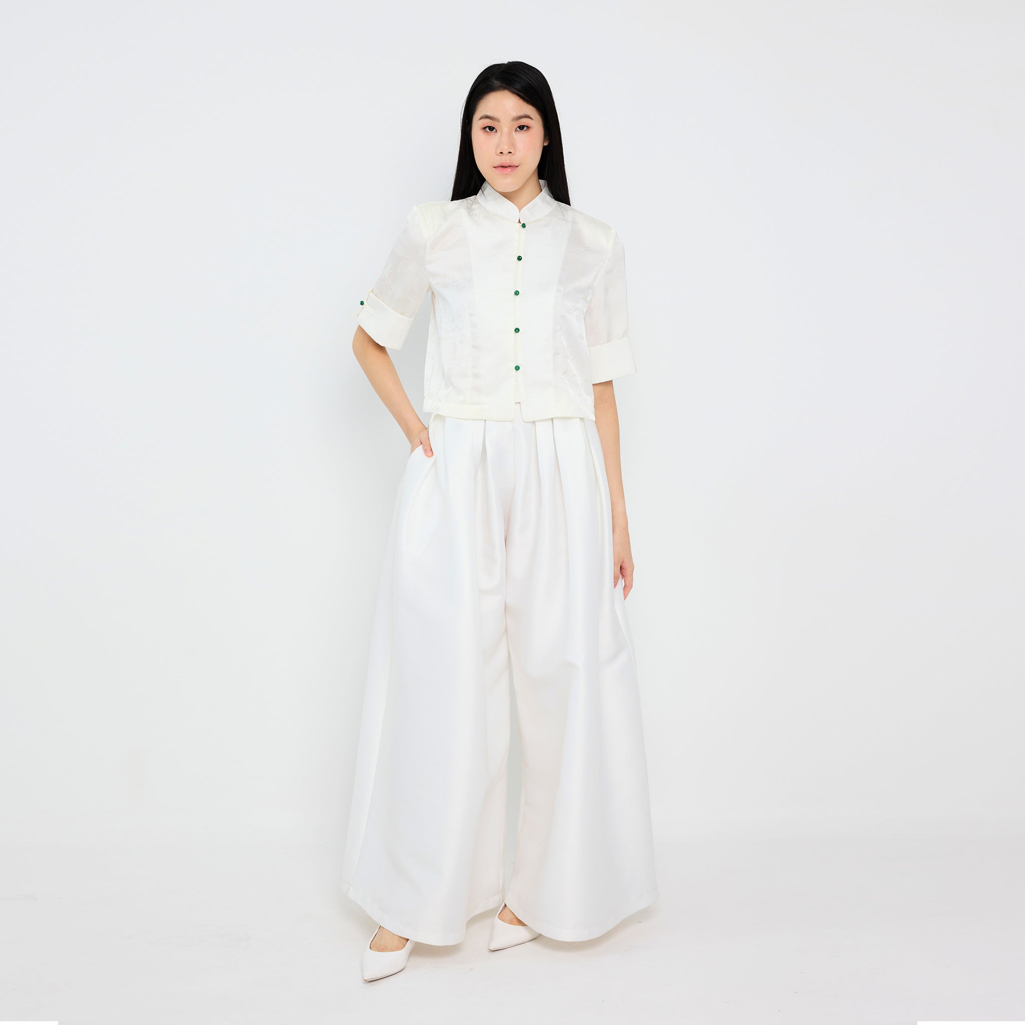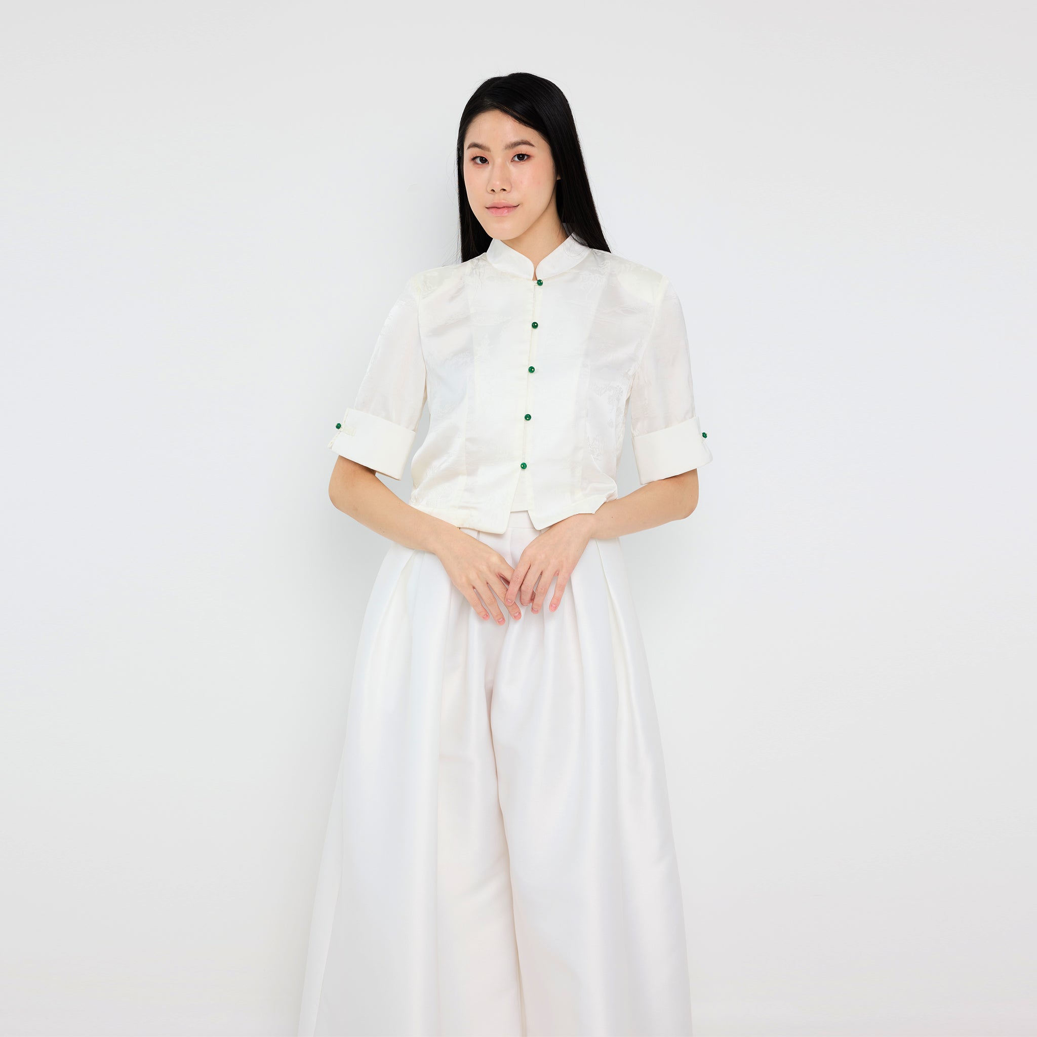 The 欣妍 Xīn Yán Qipao Jacket from our Lunar Collection ’26 is a blend of comfort and class, crafted from premium satin that feels soft and cool to the touch. This piece features a traditional Mandarin collar and short sleeves with elegant folded cuffs, complemented by a center-front closure adorned with delicate mushroom buttons like pearl. Its smooth texture and refined silhouette make it a sophisticated yet breathable choice for any festive occasion.
