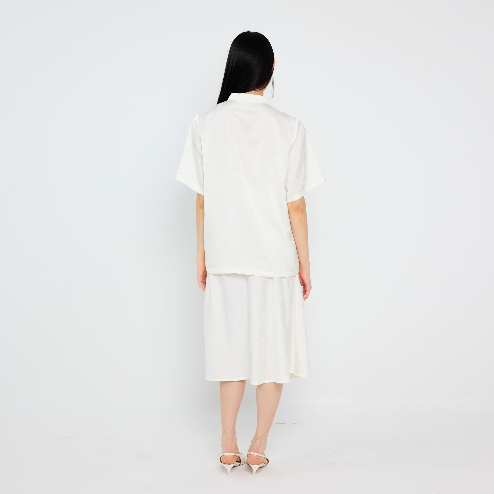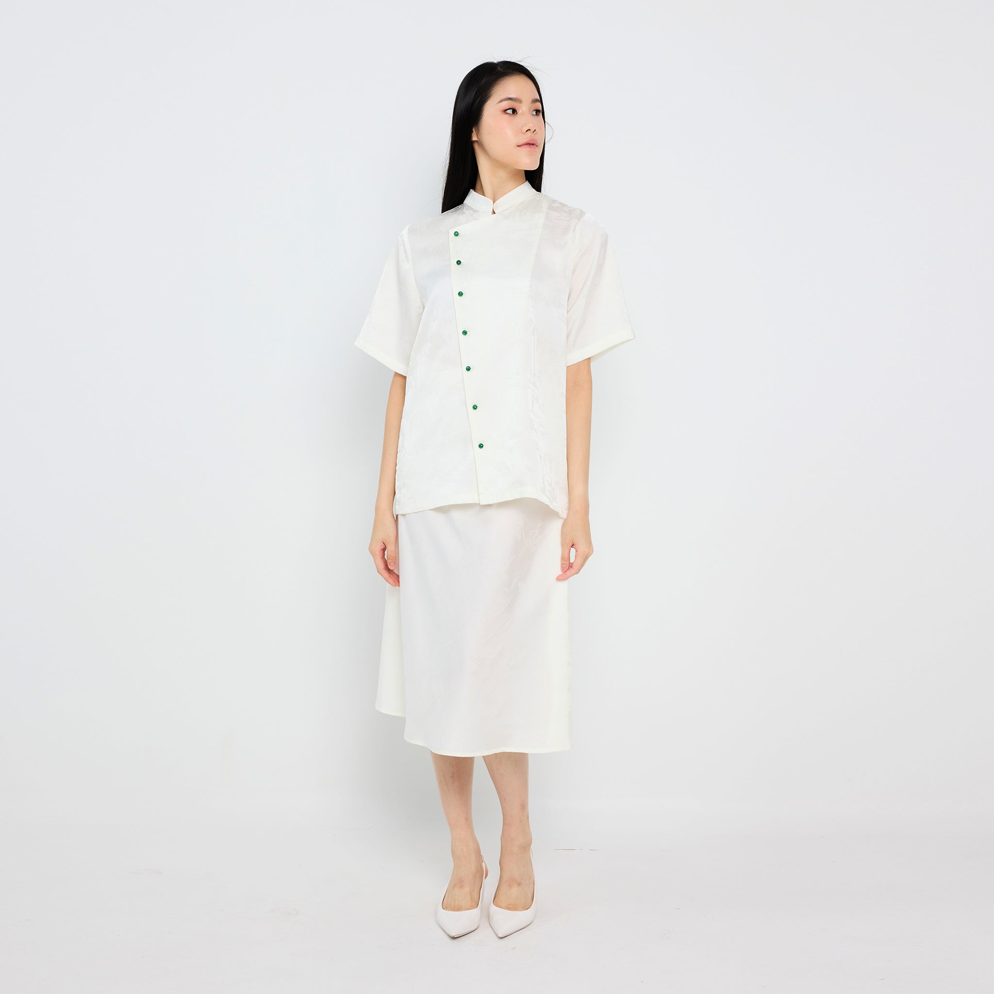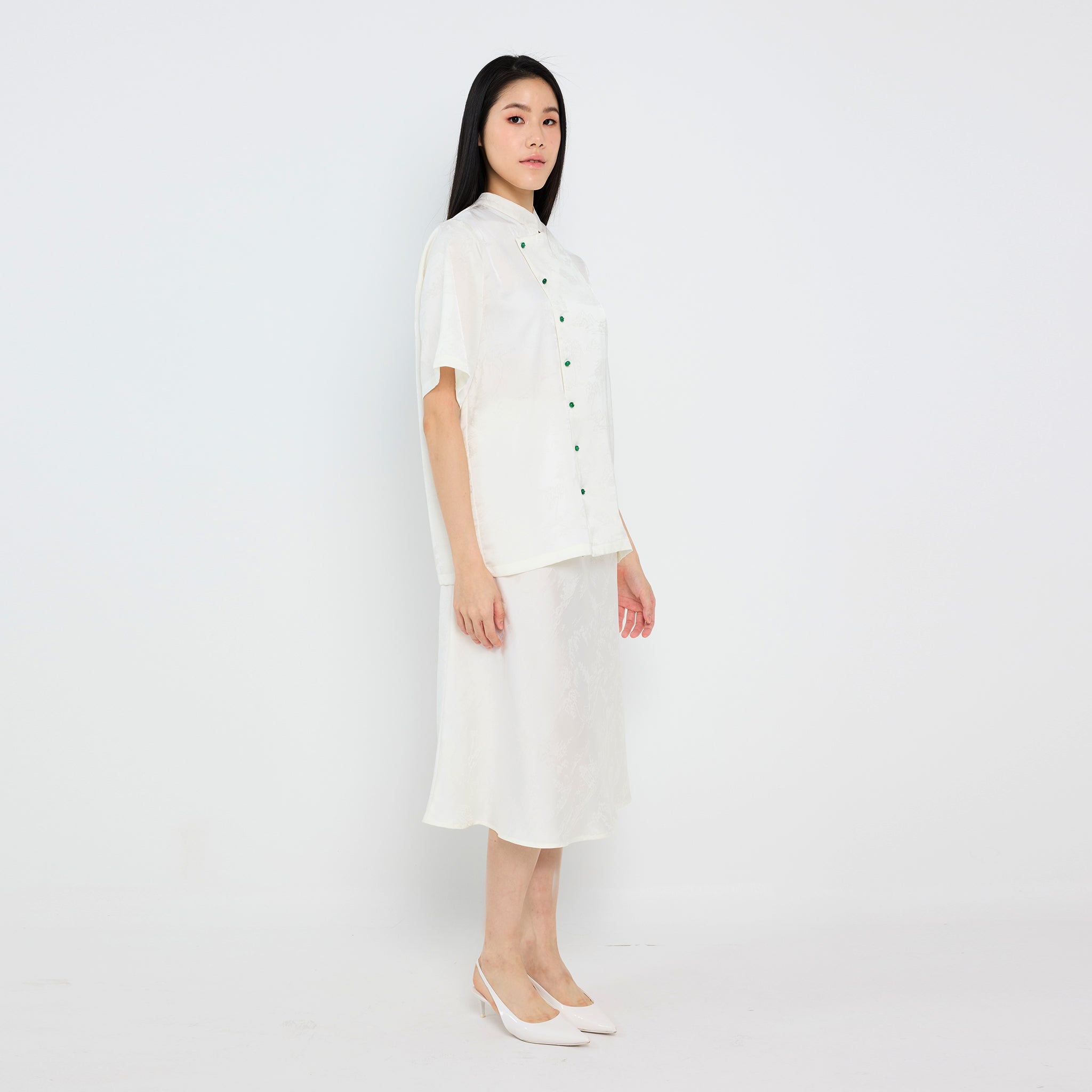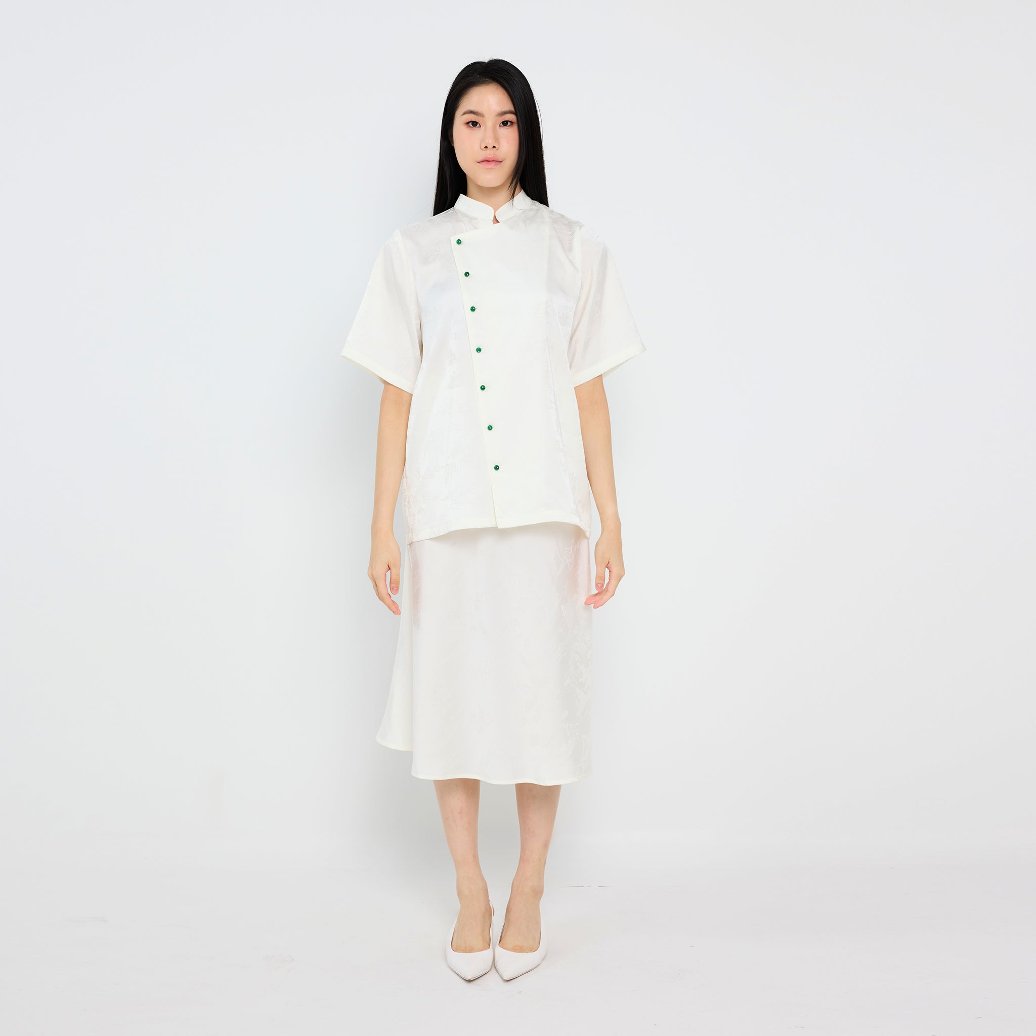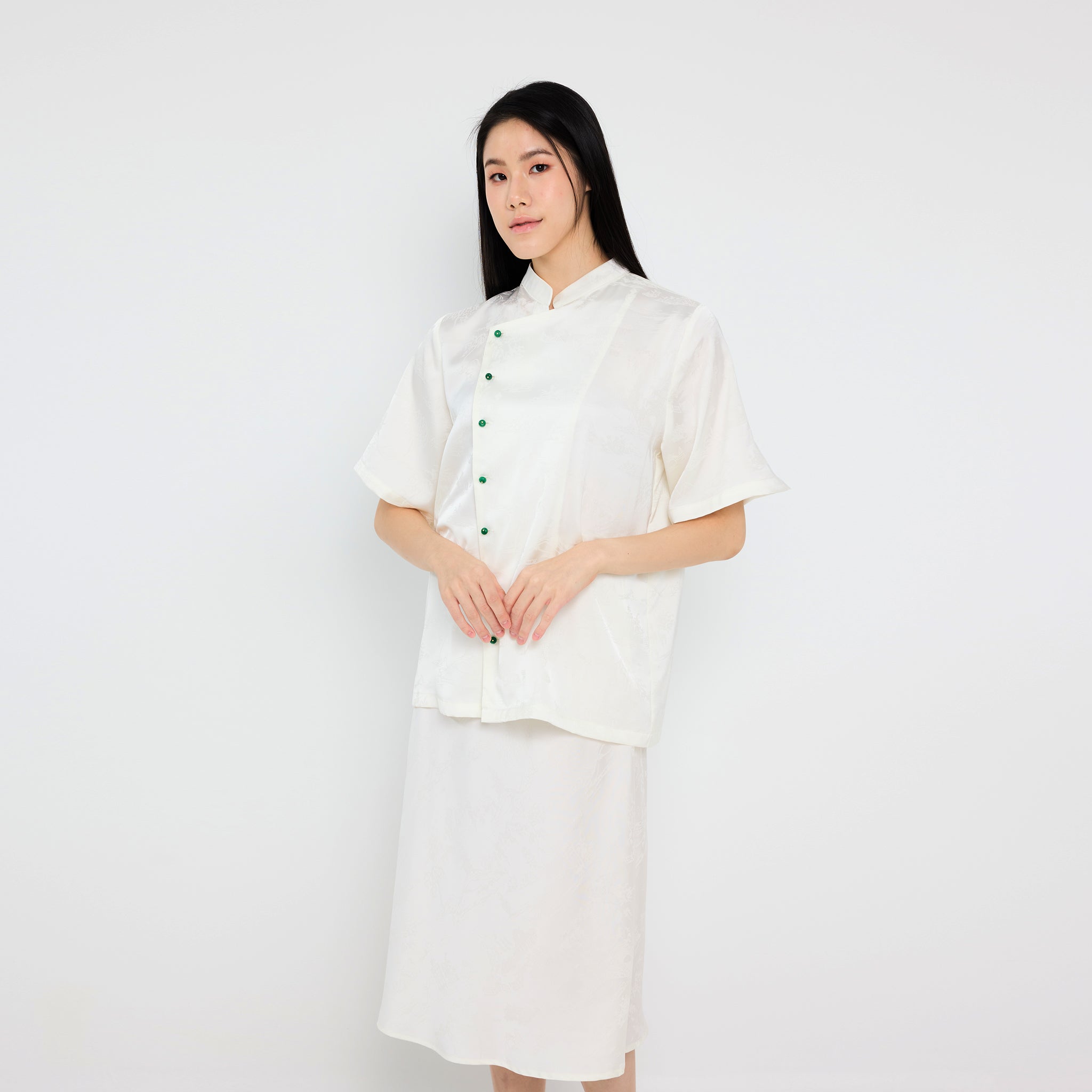 The 浩然 Hàorán Tang Shirt from the Lunar Collection '26 offers a modern take on traditional elegance, featuring a classic mandarin collar and comfortable short sleeves. Crafted from a soft, breathable satin fabric that feels cool against the skin, this piece is beautifully accented with pearl-like mushroom buttons cascading down the left side for a sophisticated touch.