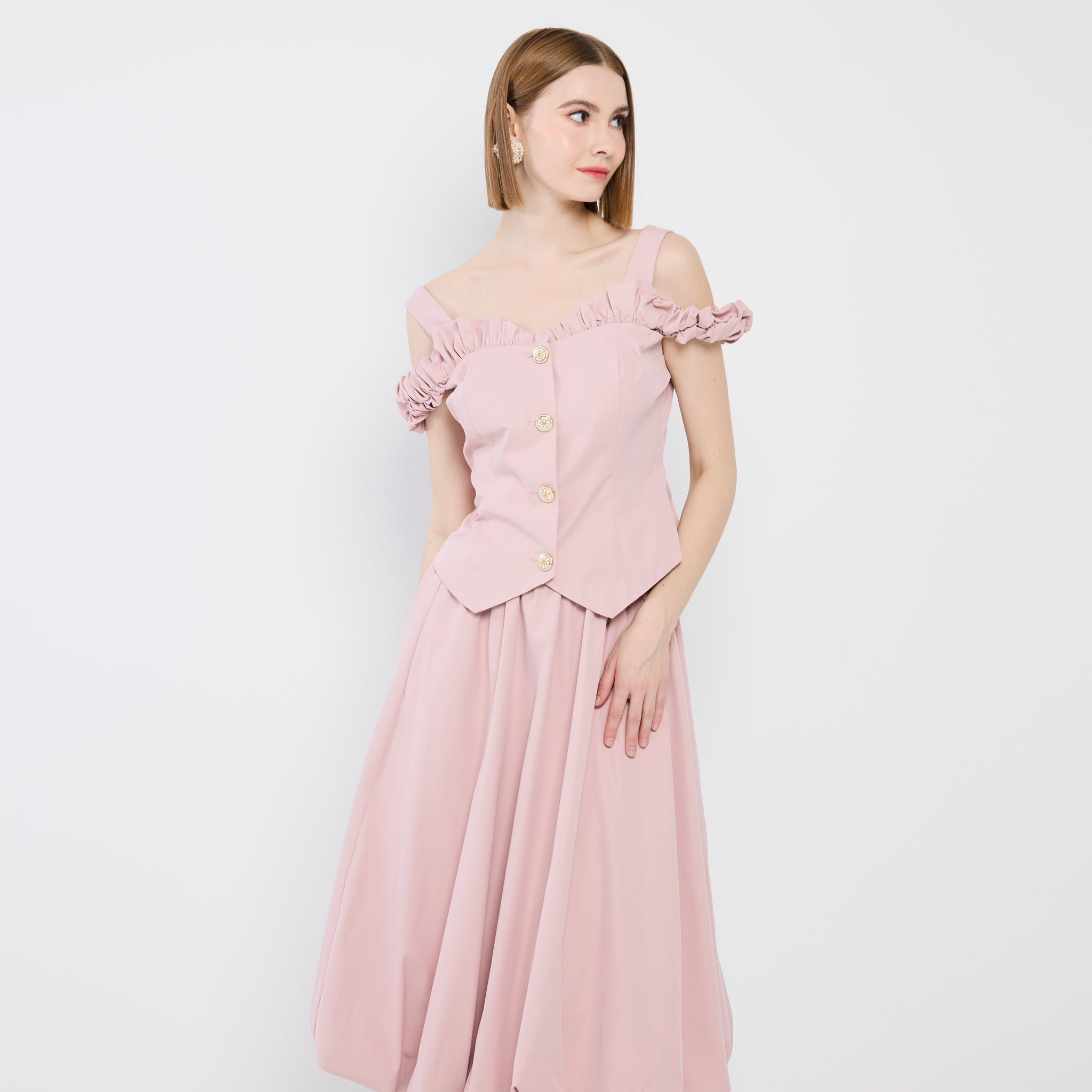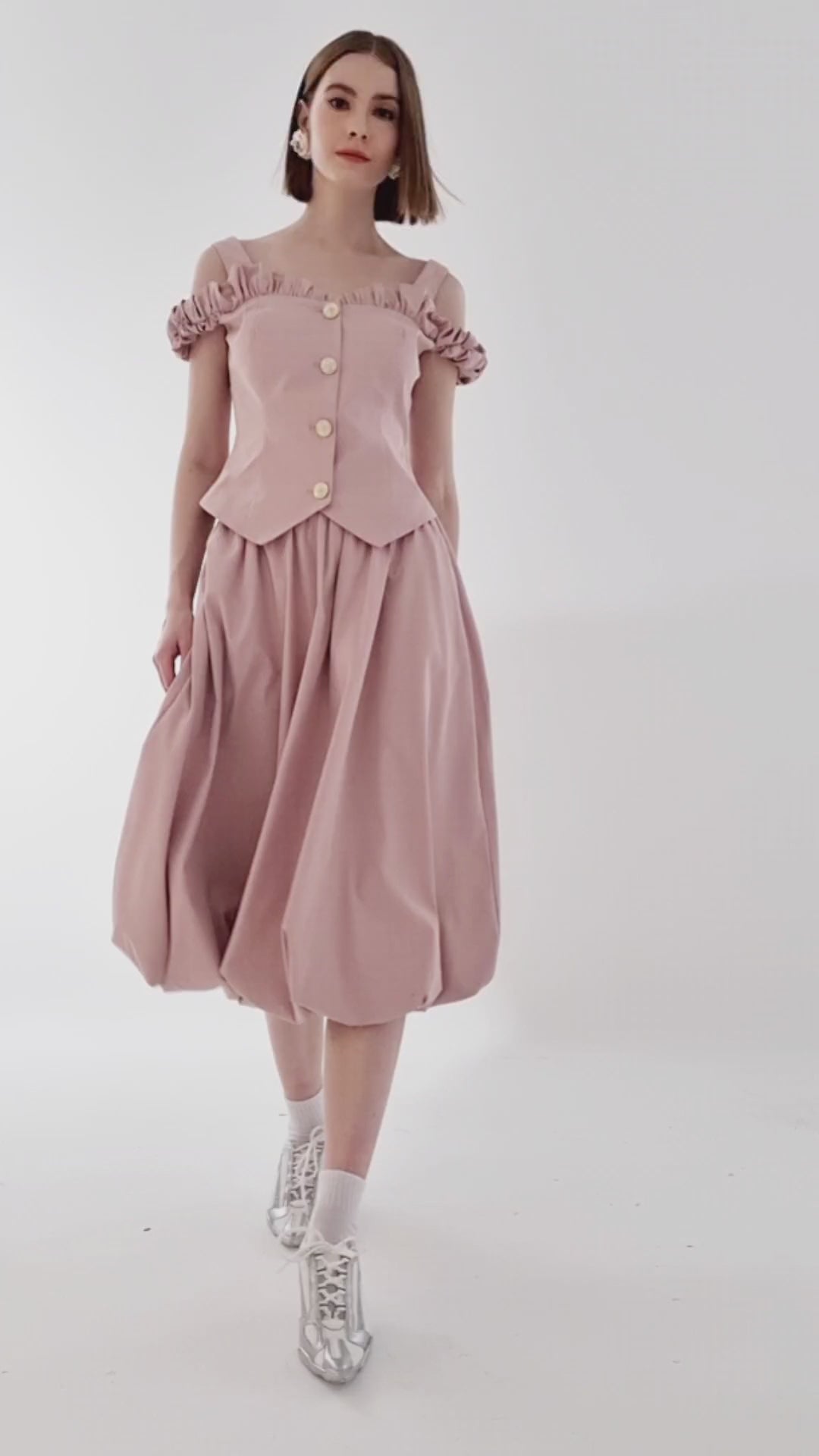Featuring large front button openings, structured straps, and softly ruffled off-shoulder detailing, this romantic top also adds a polished yet playful touch to any look.