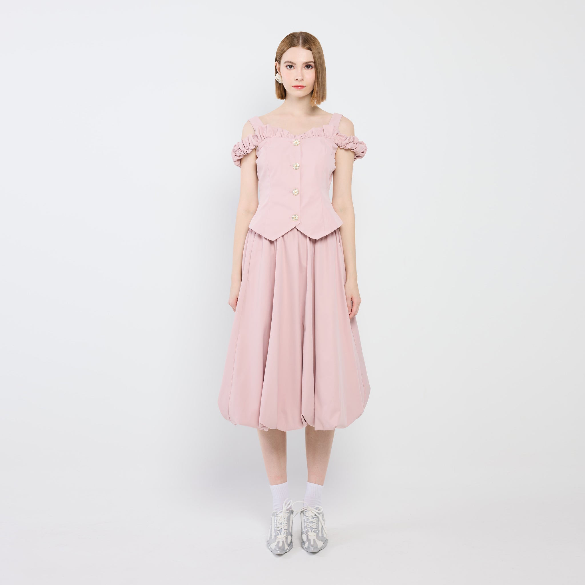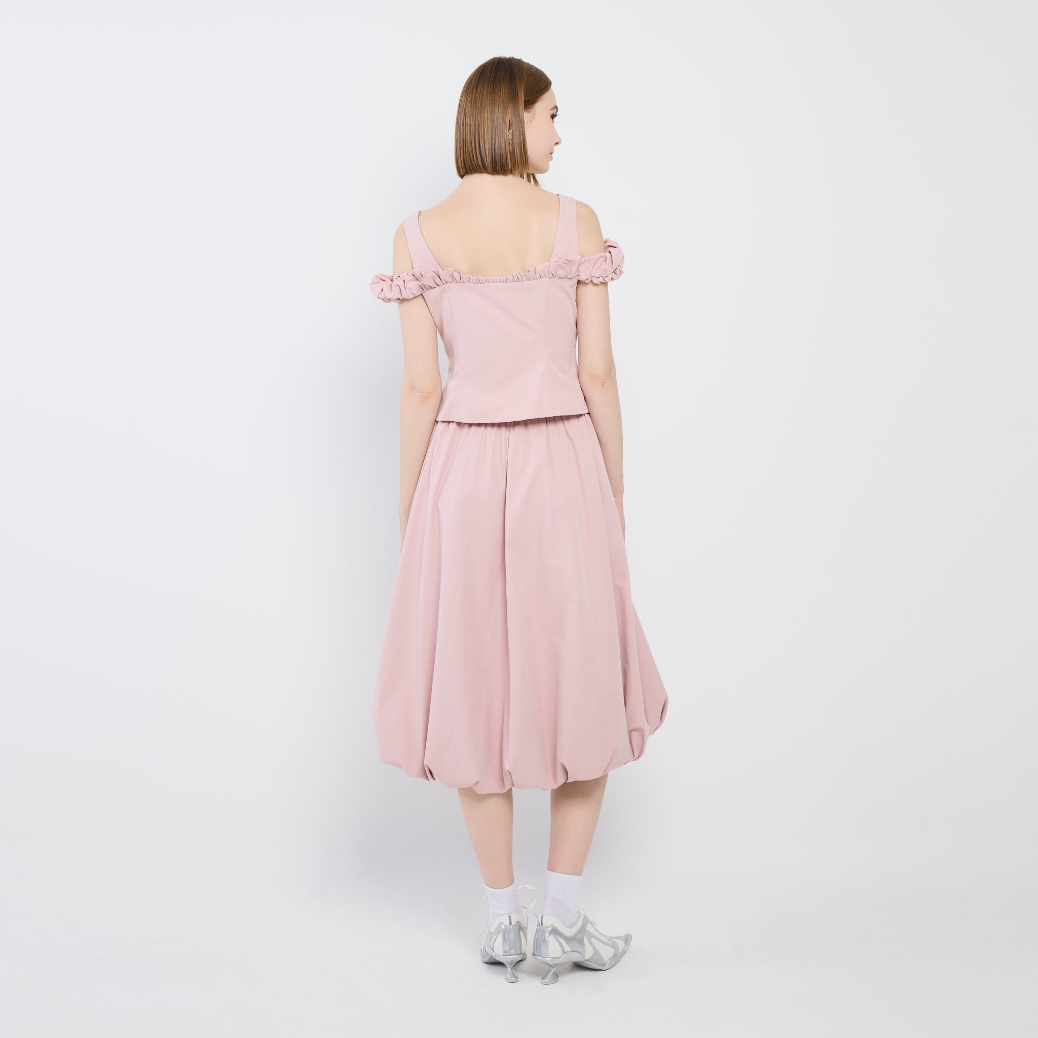 Featuring an easy elastic waistband and a sculpted silhouette, this voluminous midi bubble skirt is completed with practical side pockets for a playful yet refined touch to any ensemble.