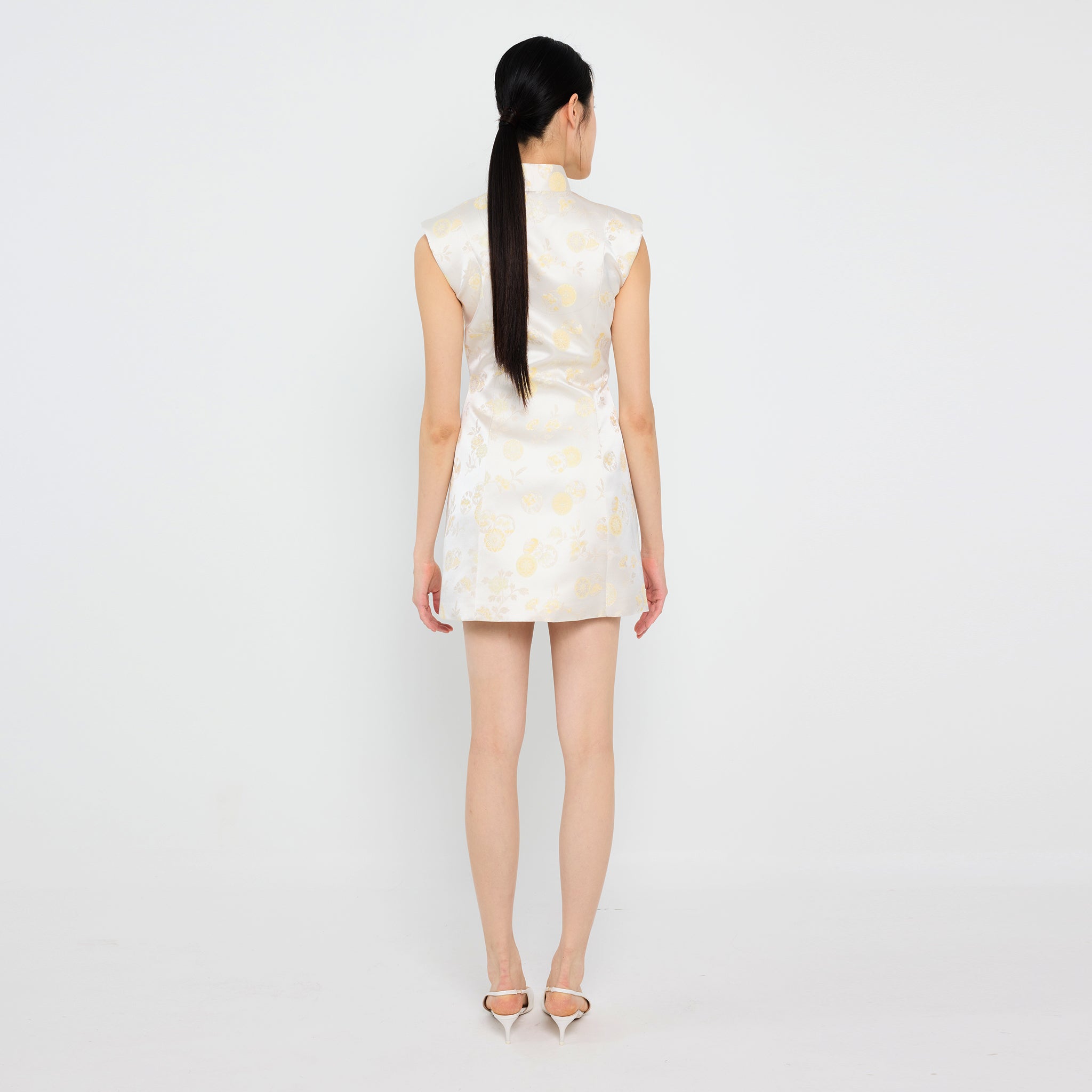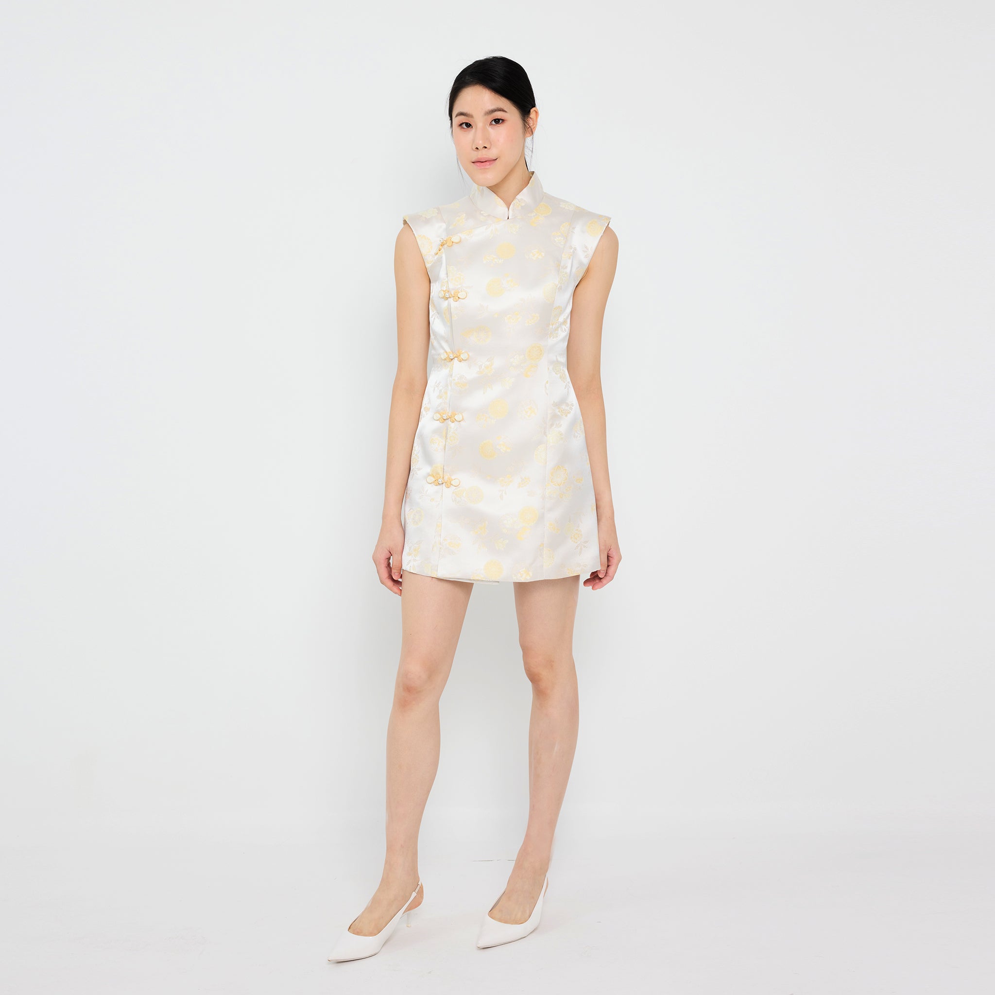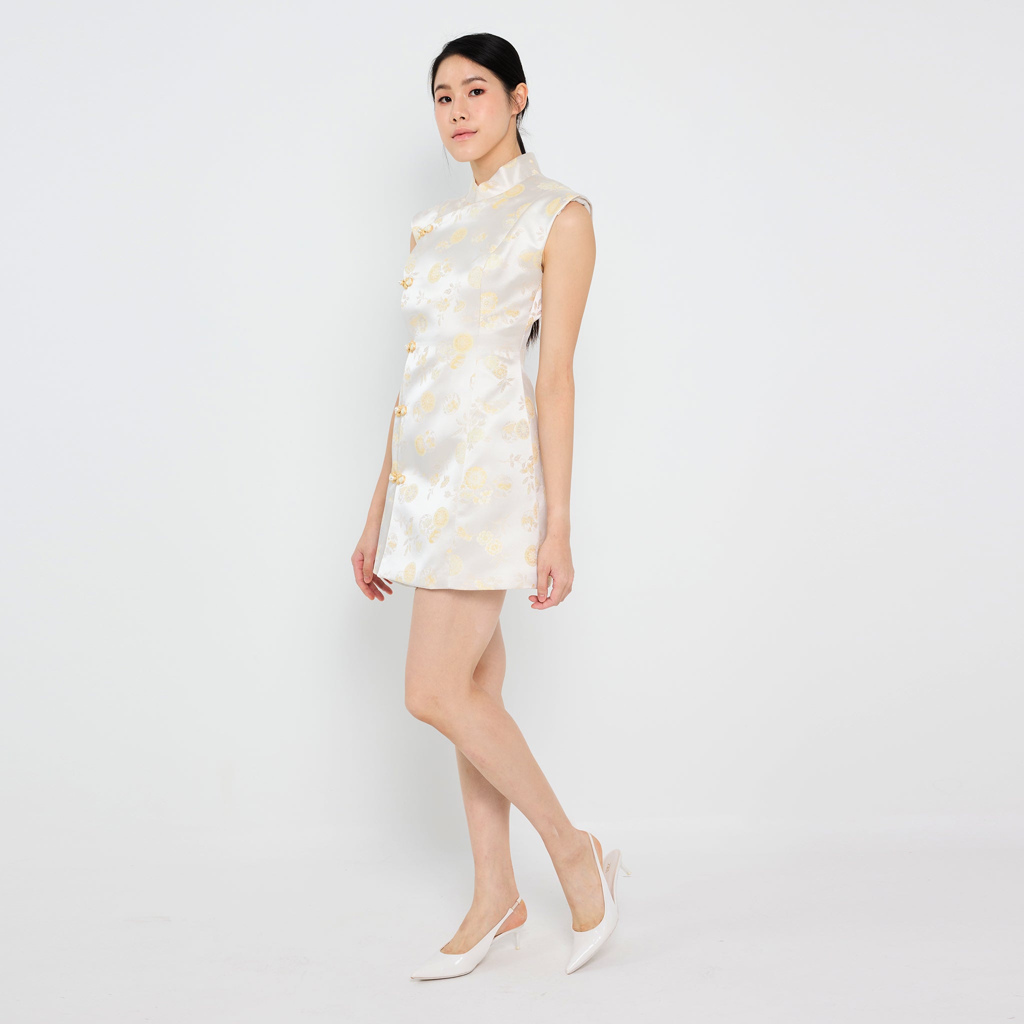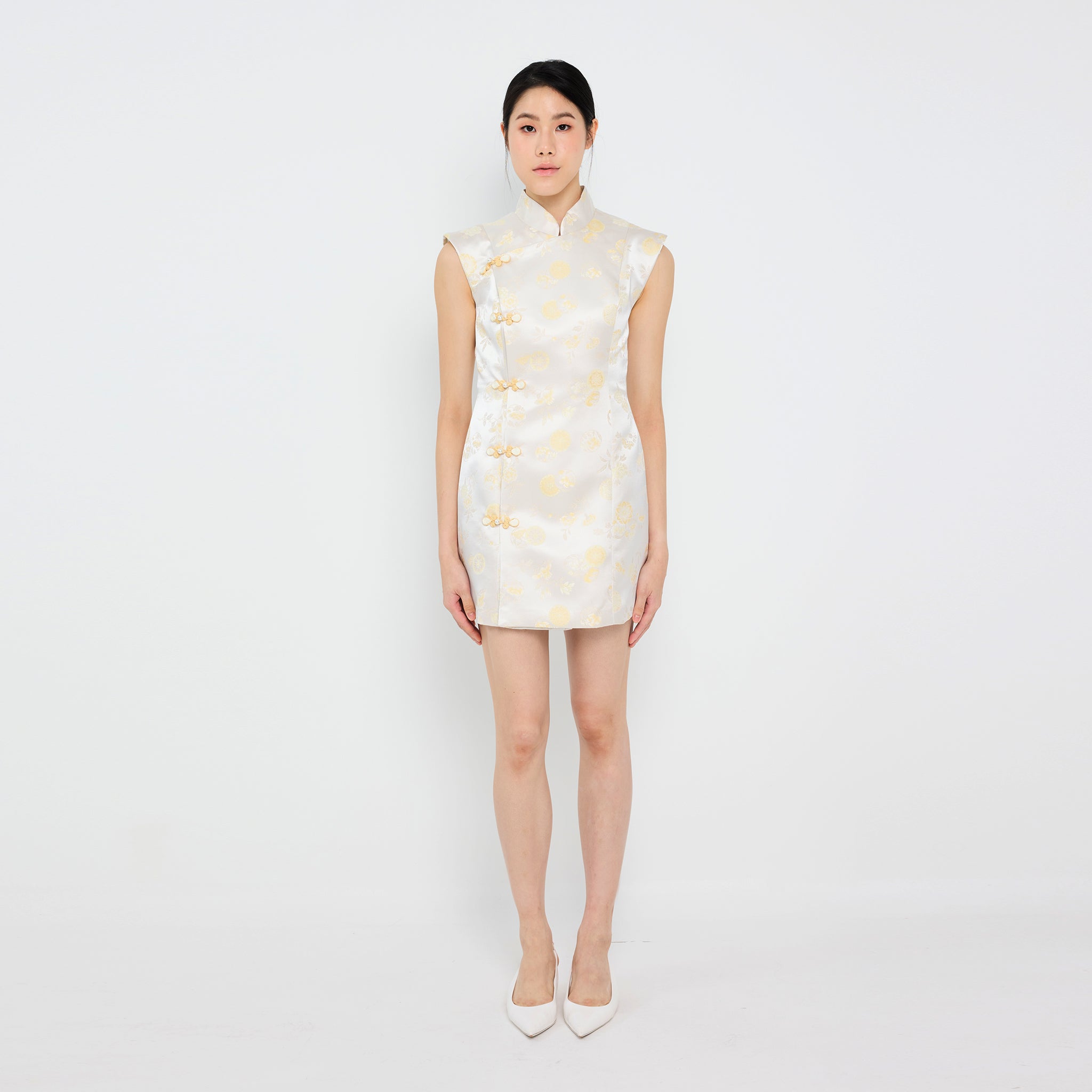 The 文静 Wén Jìng Brocade Dress combines timeless tradition with modern elegance through its soft pastel floral patterns, elegant Mandarin collar, and artistic asymmetrical "pankou" knots on the right side to complete your Lunar New Year celebration.