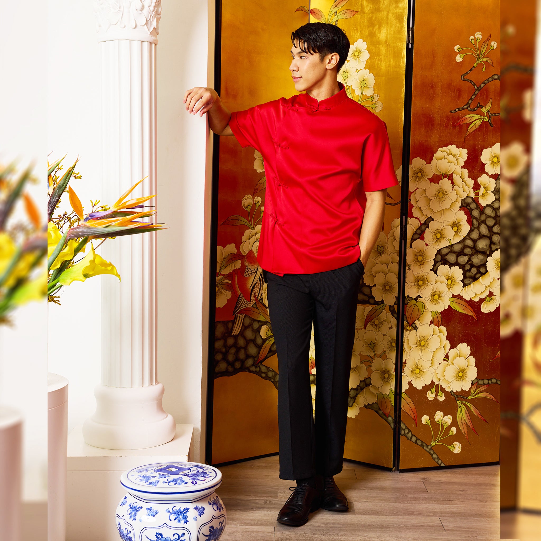 A classic top with a modern twist, featuring luxurious red satin fabric and a subtle sheen. The design is captivating with a traditional Mandarin Collar and authentic knot buttons (Pankou) down the side. Perfect for Chinese New Year celebrations and other festive occasions.