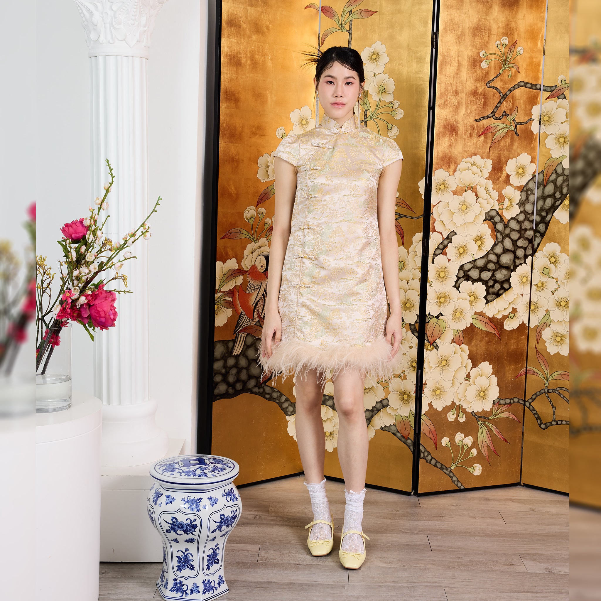 The Li Mei Feather Dress is a refined mini silhouette crafted from luxurious brocade. Designed with a classic mandarin collar and elegant cap sleeves, it features traditional pankou button detailing for a timeless Chinese-inspired touch. Soft feathers trim the hem, adding light movement and modern femininity to this sophisticated statement piece.