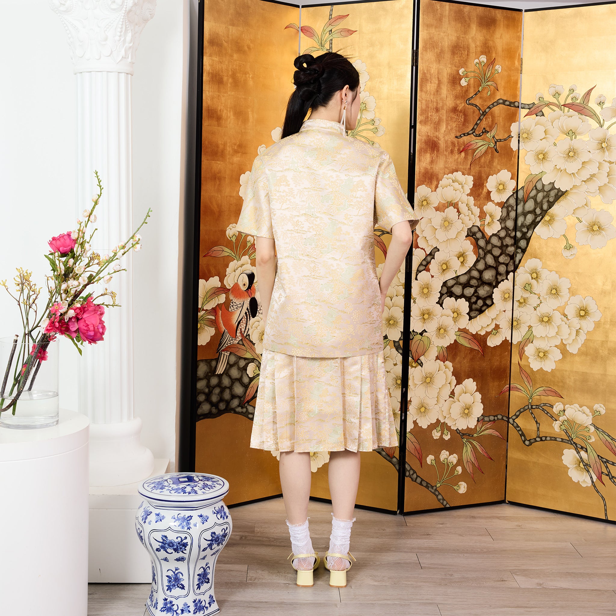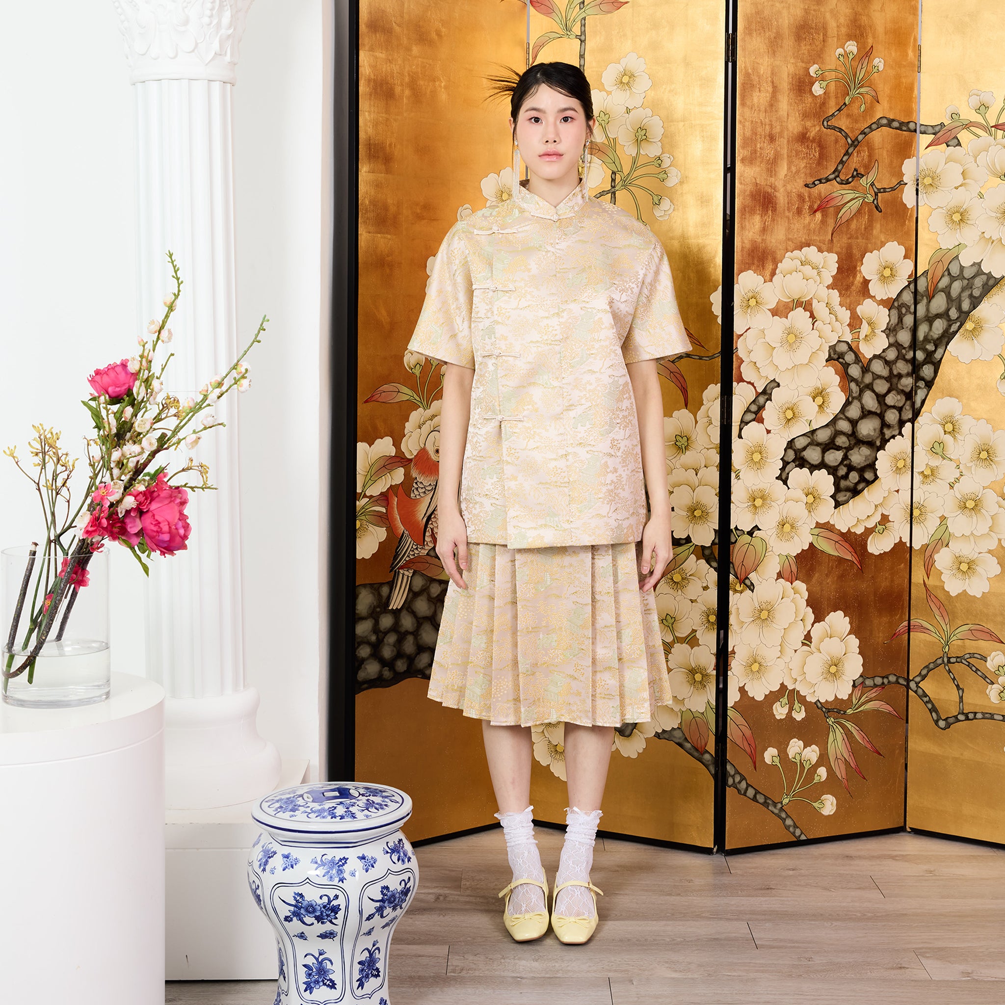 The Li Mei Unisex Top is a refined blend of traditional Chinese design and modern versatility. Crafted from textured brocade paper fabric, it features a classic mandarin collar, short sleeves, and traditional Chinese button detailing placed on the left side. Designed for all genders, this contemporary piece offers understated elegance with cultural character.