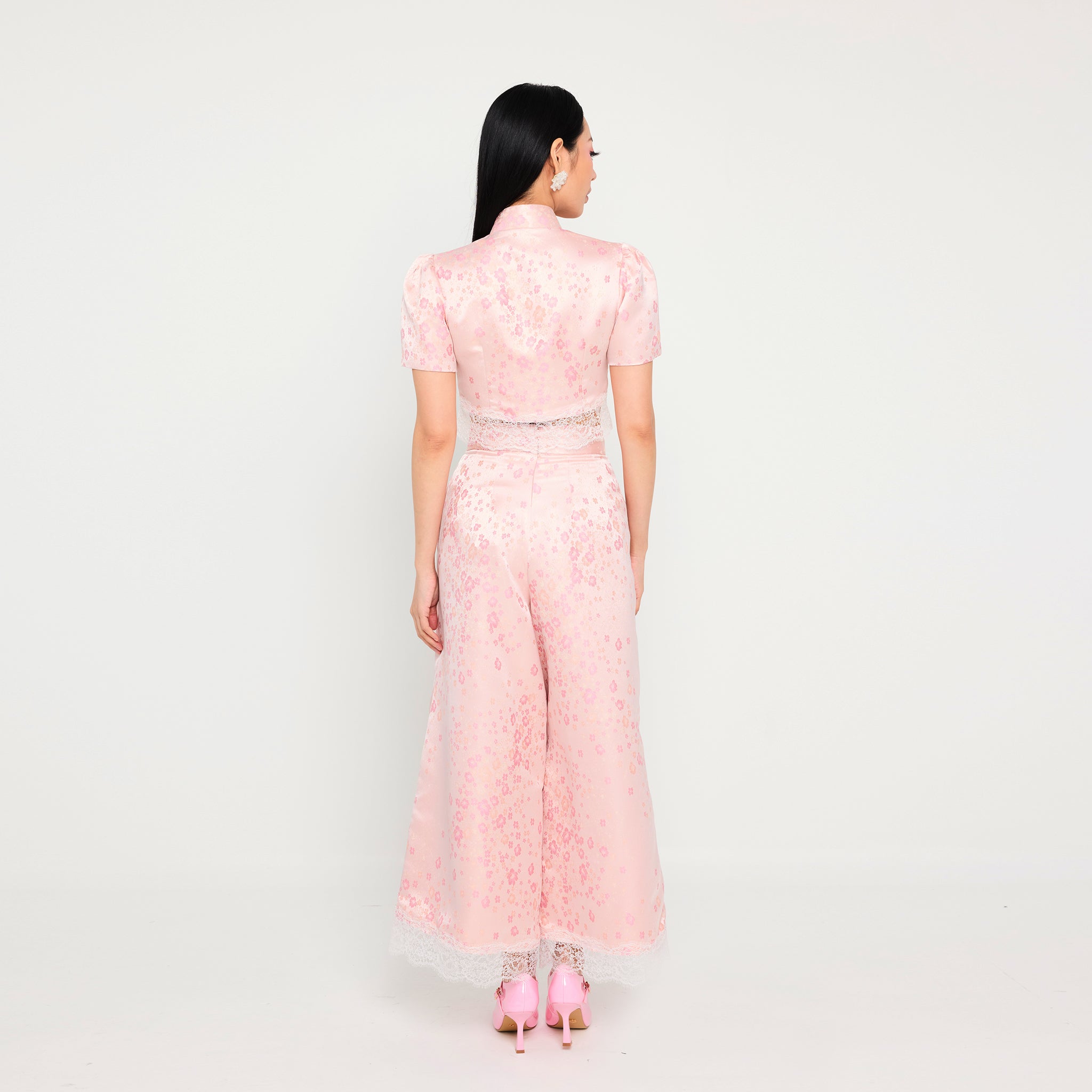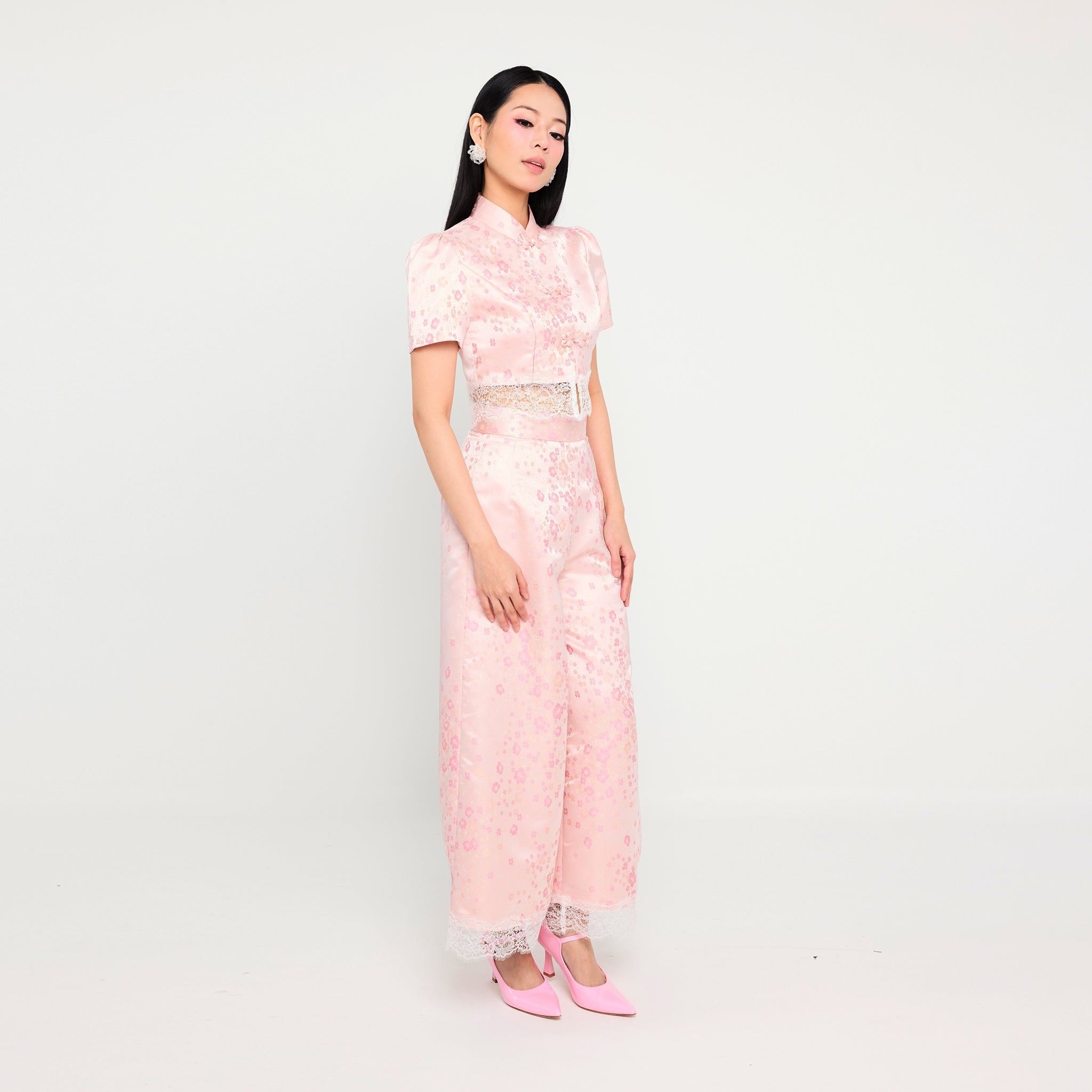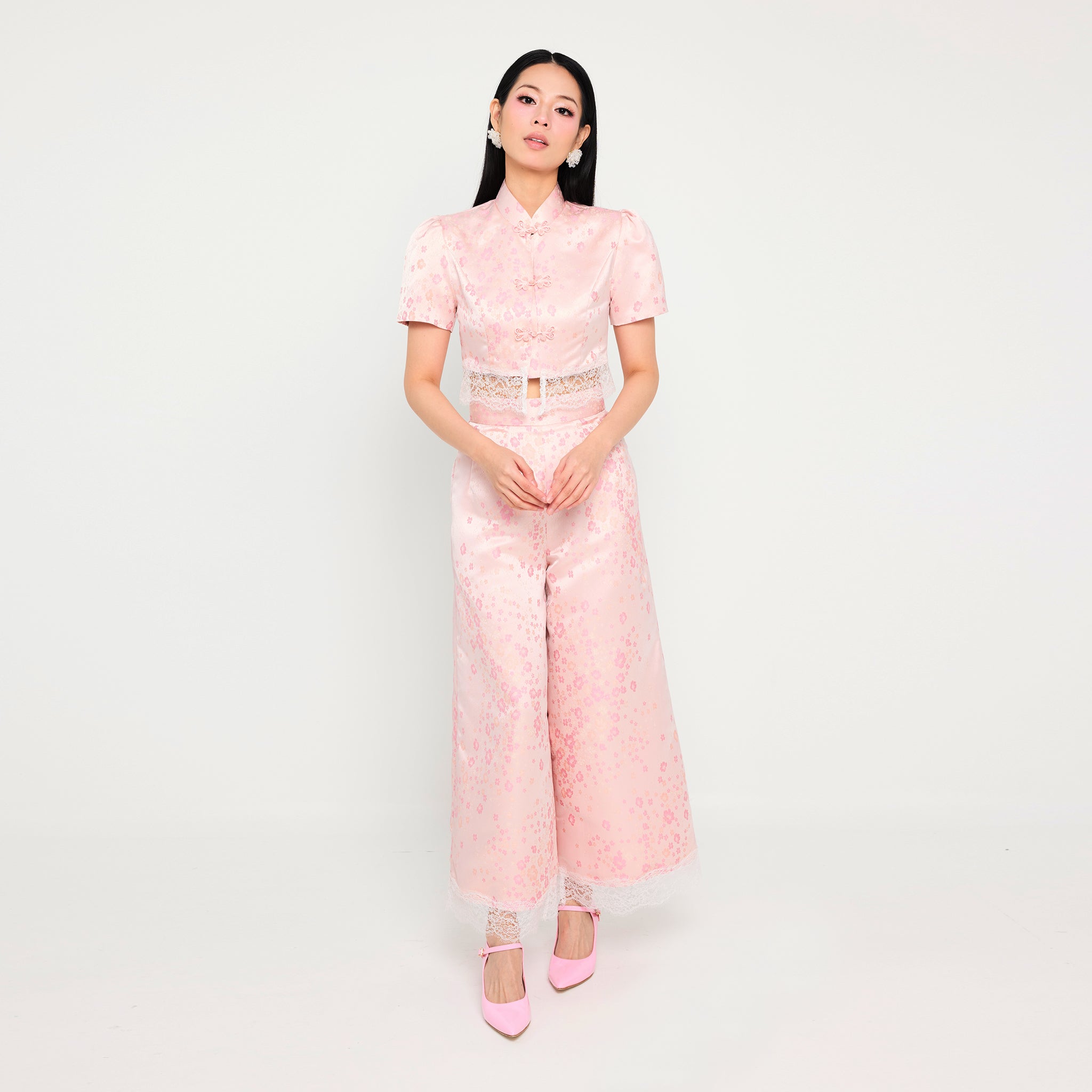 Elevate your Lunar New Year (CNY) style with the Li Ting Lace Crop Top, a perfect blend of traditional essence and modern flair. Crafted from premium pink floral brocade, this piece features a classic Mandarin collar, pangkou buttons, and trendy puff sleeves. The delicate lace trim at the hem adds a romantic touch, making it an ideal match for high-waisted bottoms for an elegant and stylish look.