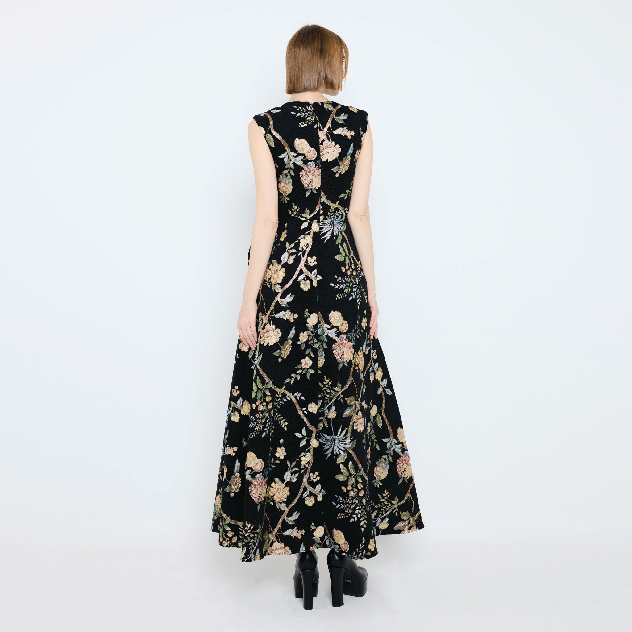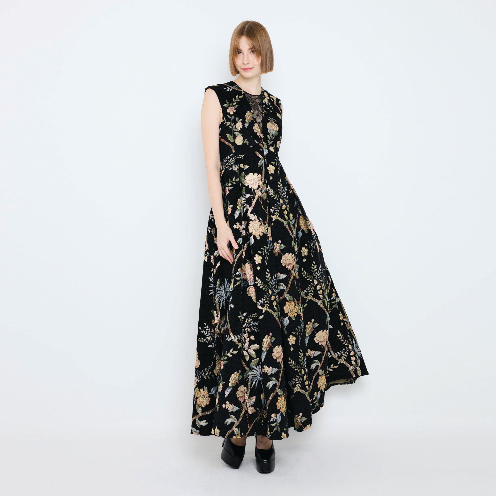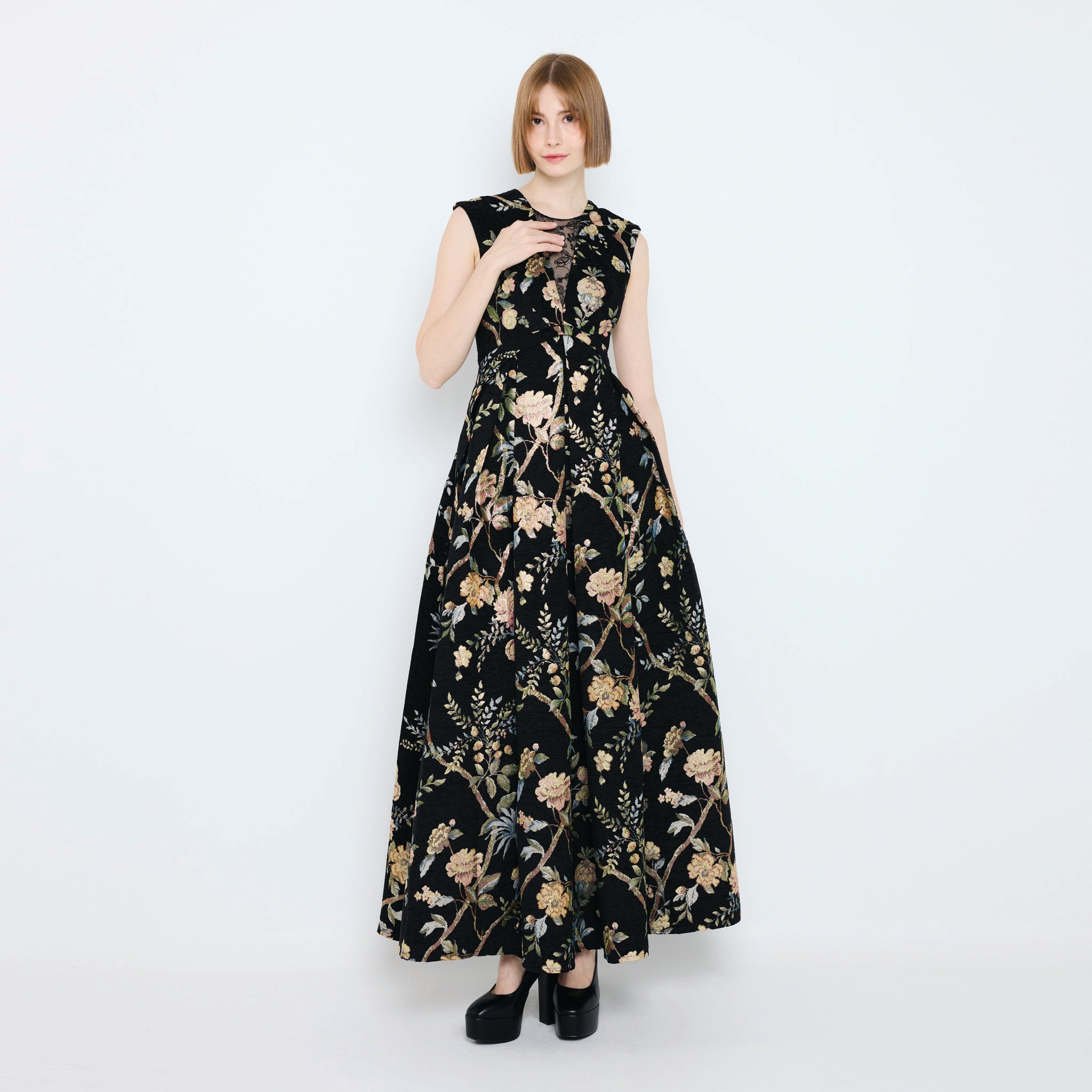 A sleeveless maxi jacquard dress adorned with a lush floral motif, finished with a delicate lace panel at the neckline for a touch of romance. Its fitted bodice and flowing skirt create an elegant silhouette, while discreet side pockets add effortless practicality.