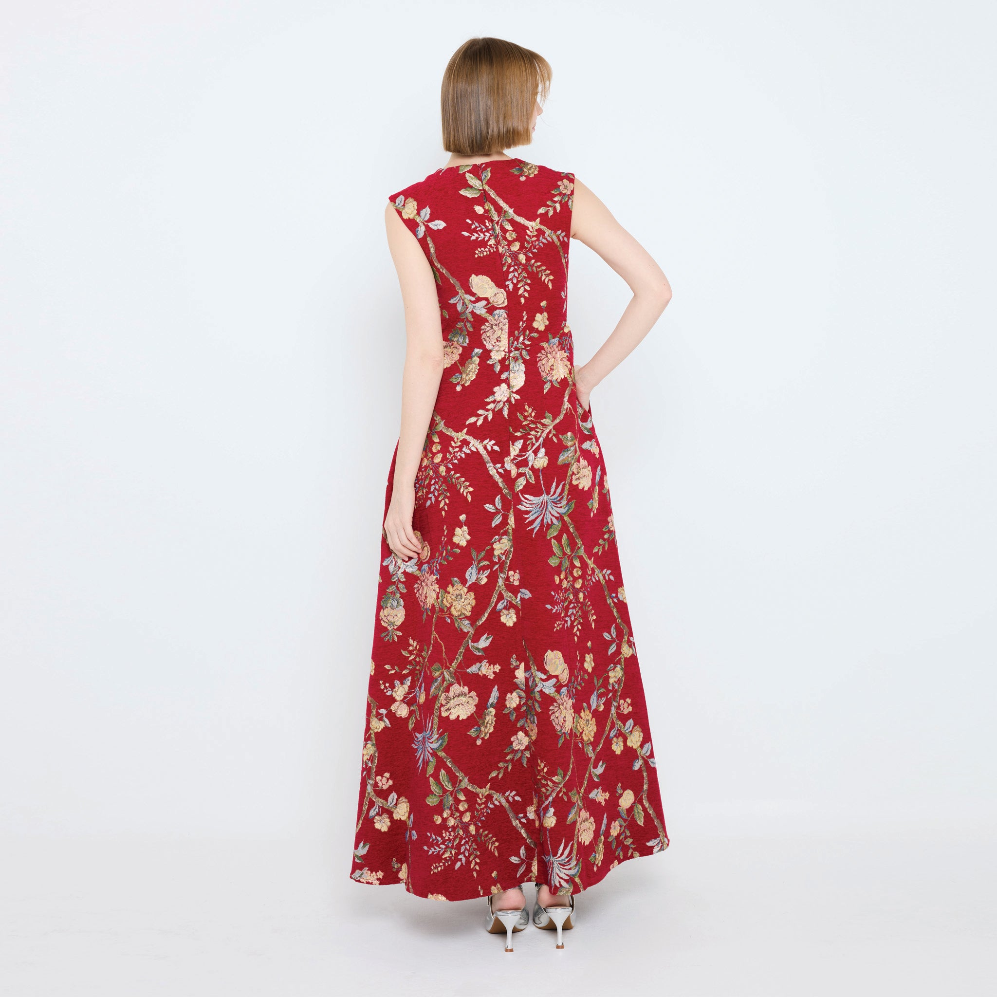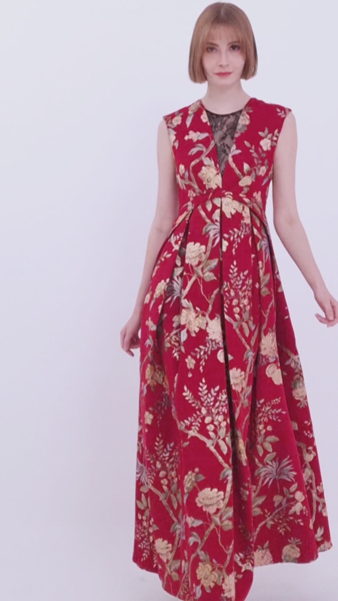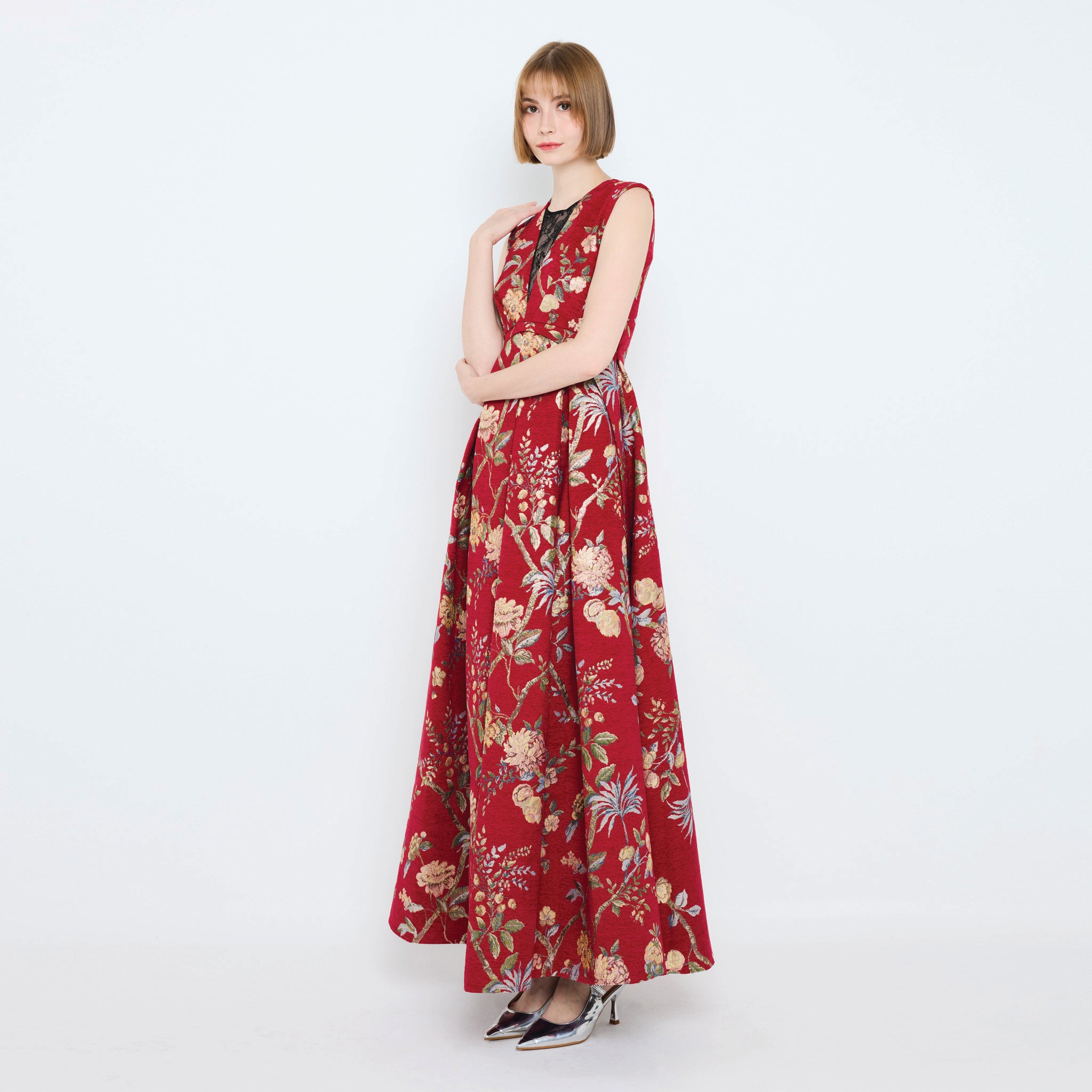 A sleeveless maxi jacquard dress adorned with a lush floral motif, finished with a delicate lace panel at the neckline for a touch of romance. Its fitted bodice and flowing skirt create an elegant silhouette, while discreet side pockets add effortless practicality.
