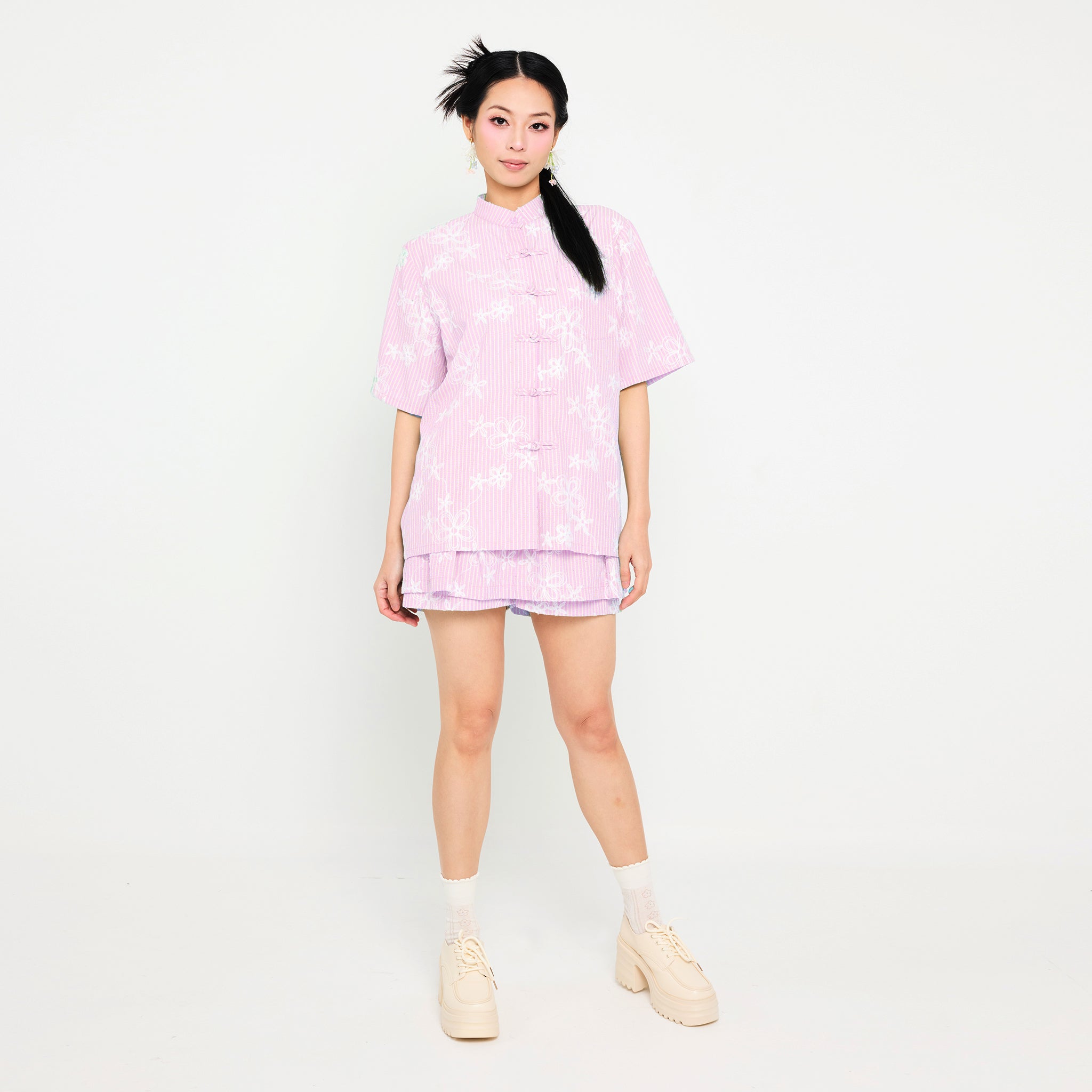 The Yúzé Stripe Shirt is a unisex piece featuring a chic mandarin collar and short sleeves, highlighted by delicate pankou button details that add a subtle traditional touch. Designed on a soft pastel base in gentle shades of green, pink, and blue, it is finished with a charming white floral pattern for a fresh, modern feel. Crafted from breathable, comfortable fabric, this cropped silhouette pairs effortlessly with high-waisted bottoms, creating a stylish and contemporary look for all.