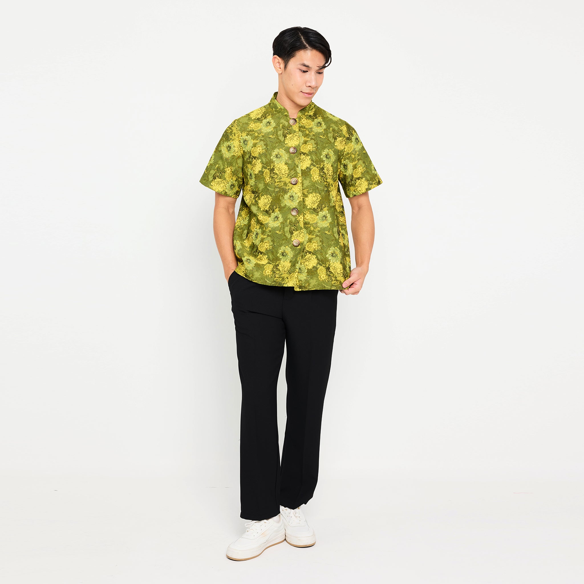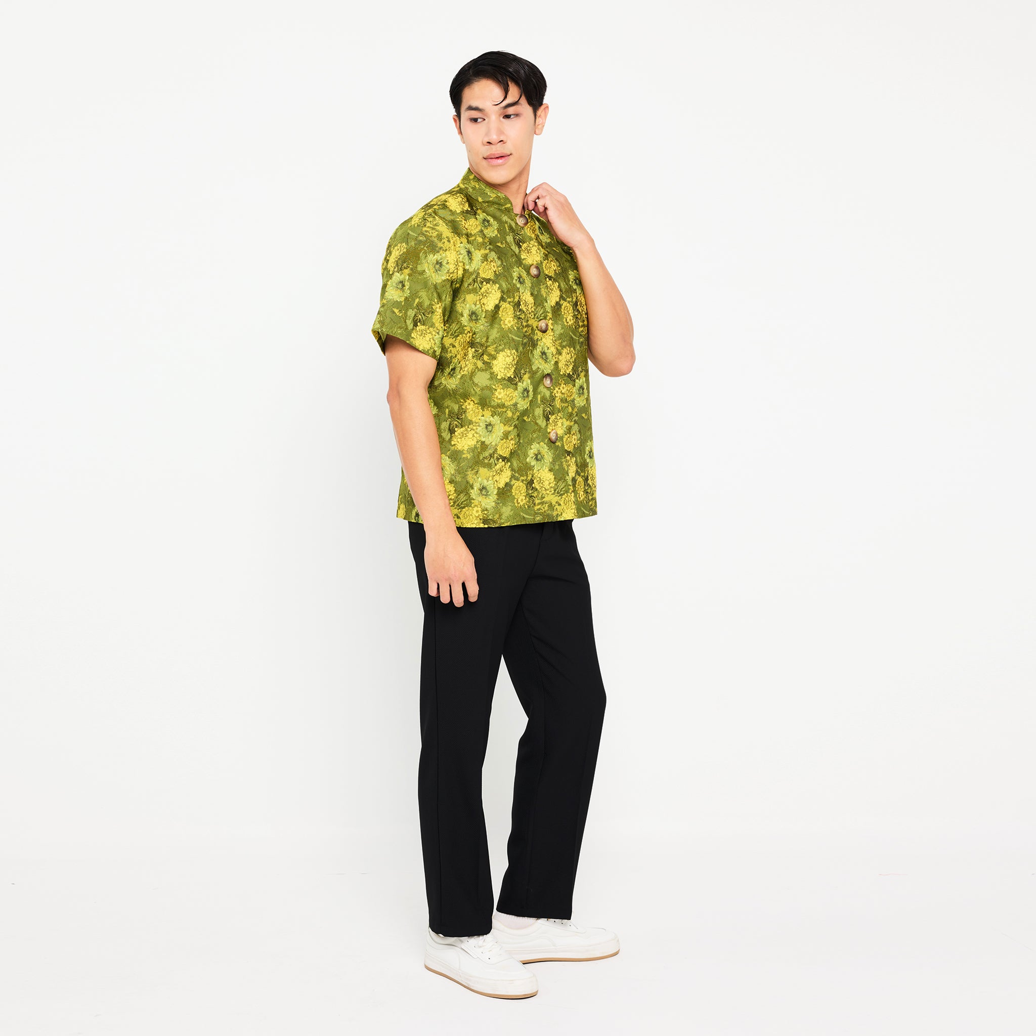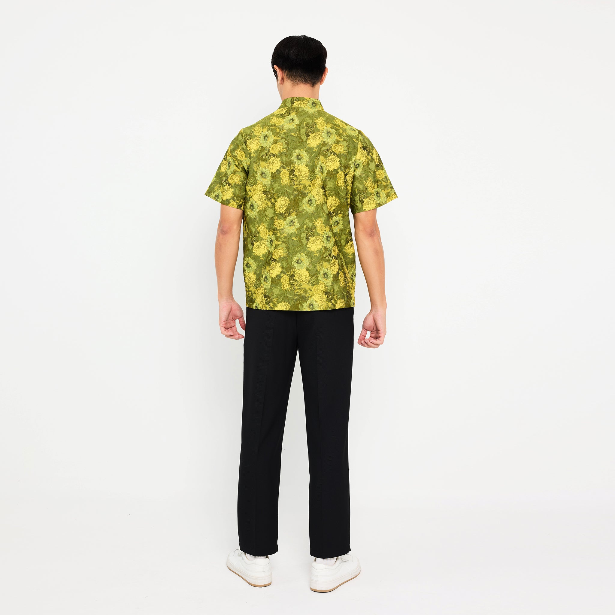 Celebrate Lunar New Year in style with this short-sleeve, unisex shirt. Featuring a classic mandarin collar and vibrant green floral pattern, it’s lightweight, breathable, and perfect for coordinated looks. Effortlessly chic for any festive outfit.