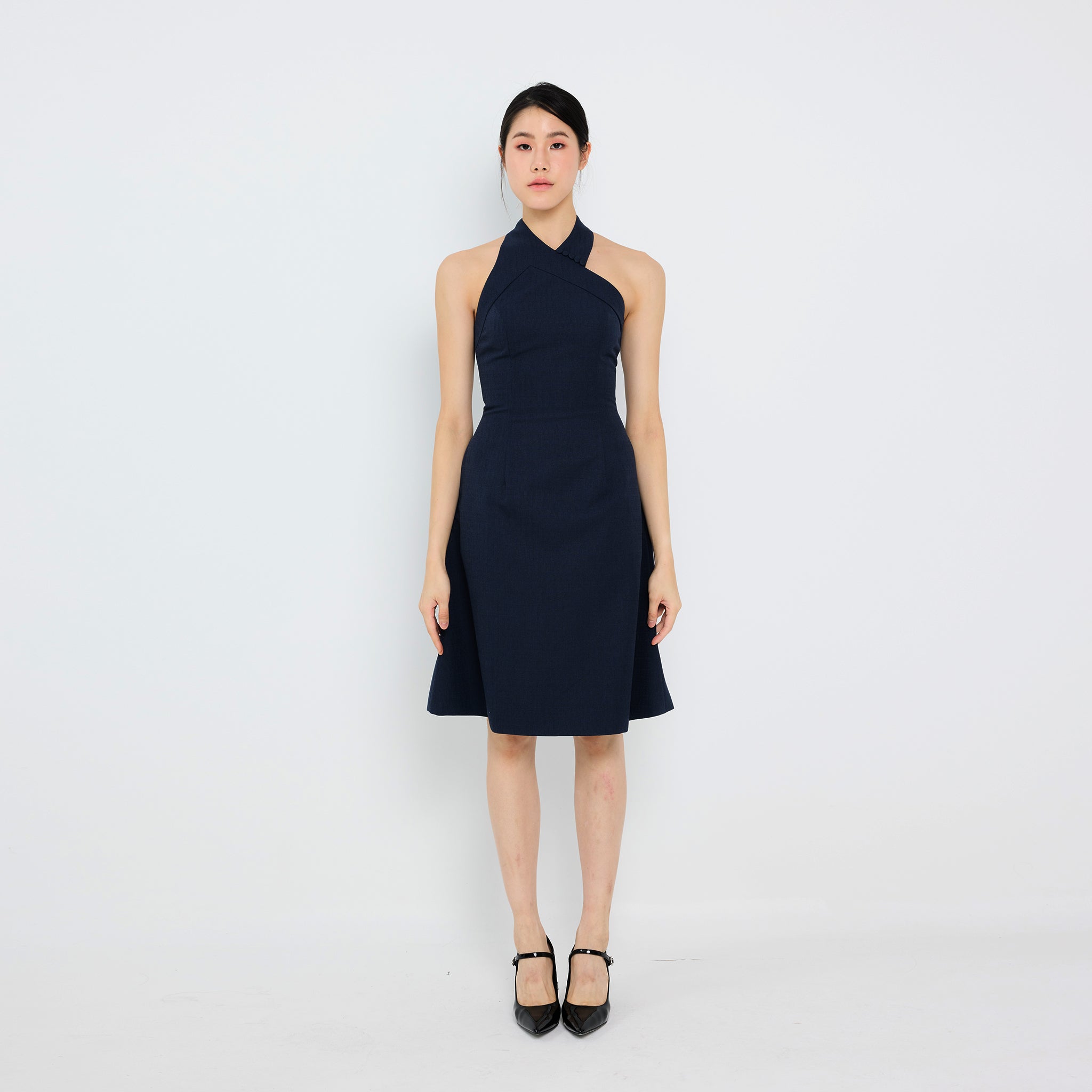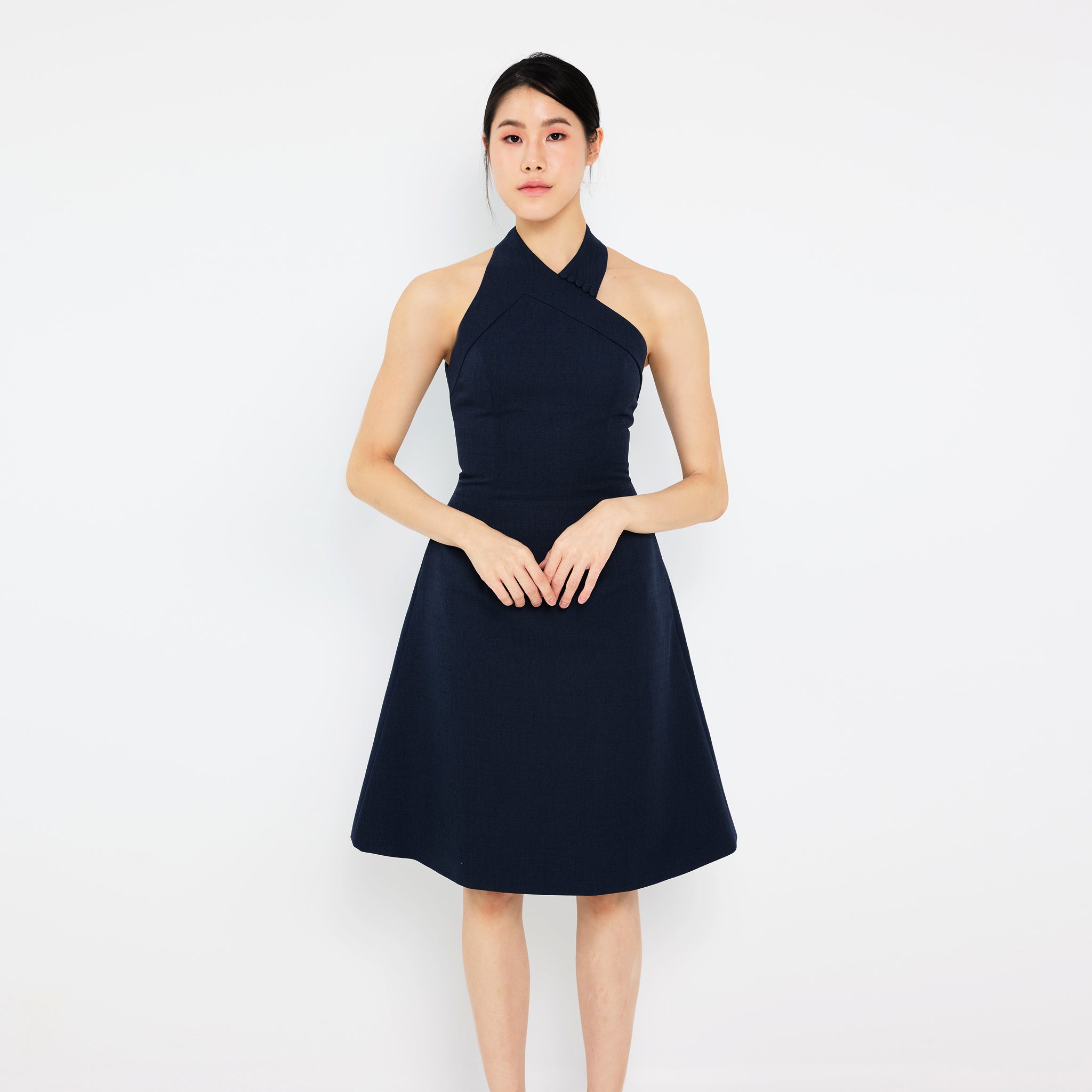 Ailian Halter Dress features a halter neckline and sleeveless design, complemented by an elegant midi-length skirt. The look is finished with a row of delicate mushroom buttons adorning the left side just below the neckline.