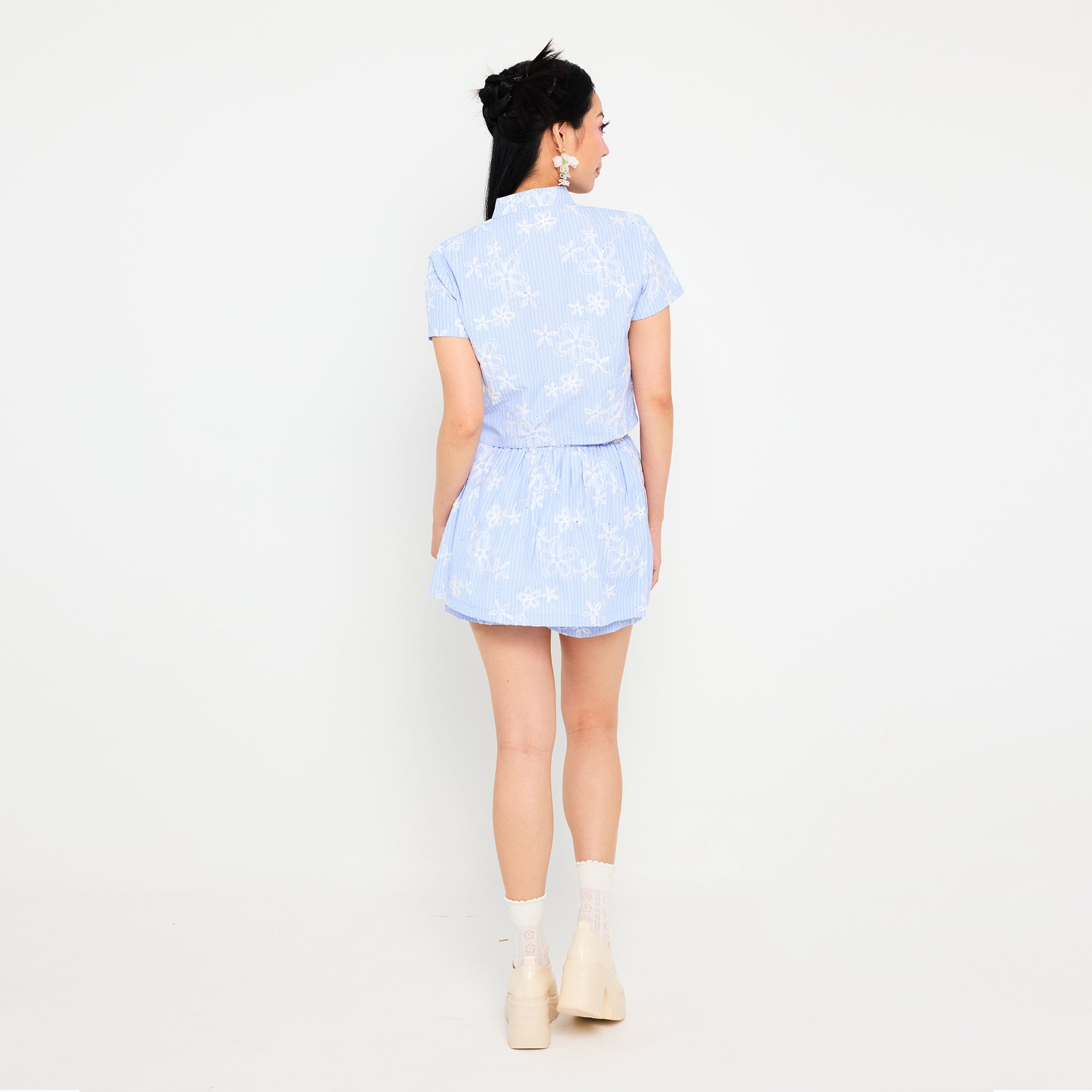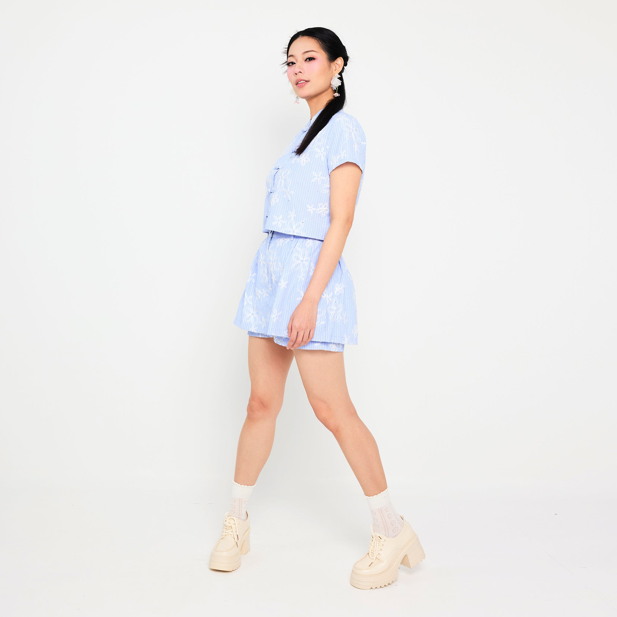 The 雅茹 Yǎ Rú Stripe Crop Top features a chic Mandarin collar and short sleeves, accented with delicate Pangkou button details for a subtle traditional touch. Designed with a pastel-colored base in soft green, pink, and blue, it is adorned with a charming white floral pattern for a fresh, feminine vibe. Made from soft, breathable fabric, this crop top offers comfort and style, with a cropped silhouette perfect for pairing with high-waisted bottoms for a modern, effortless look.