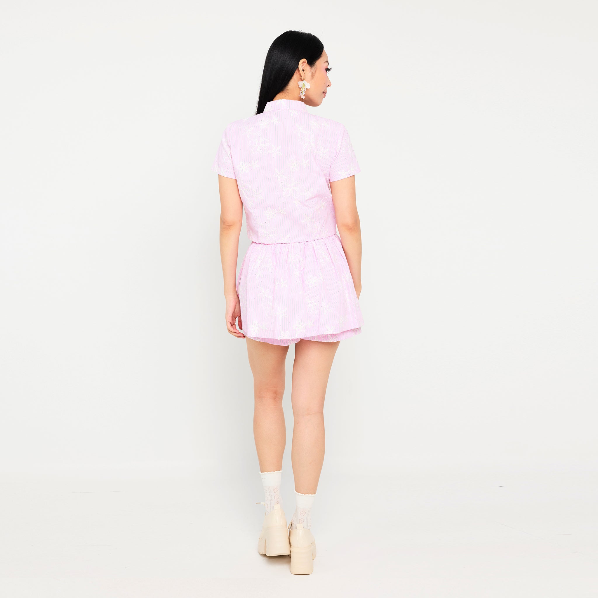 The 雅茹 Yǎ Rú Stripe Crop Top features a chic Mandarin collar and short sleeves, accented with delicate Pangkou button details for a subtle traditional touch. Designed with a pastel-colored base in soft green, pink, and blue, it is adorned with a charming white floral pattern for a fresh, feminine vibe. Made from soft, breathable fabric, this crop top offers comfort and style, with a cropped silhouette perfect for pairing with high-waisted bottoms for a modern, effortless look.