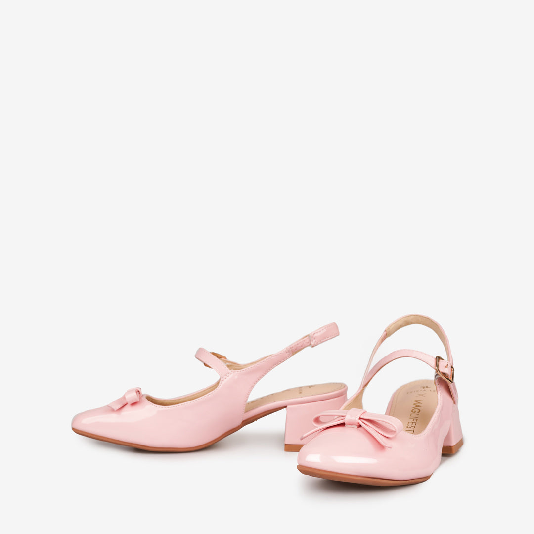 Sweet and sophisticated, these blush pink Mary Janes feature a modern square toe, slingback strap, and charming bow detail. Set on a low block heel for all-day comfort, they strike the perfect balance between playful femininity and timeless elegance — ideal for both everyday wear and special occasions.