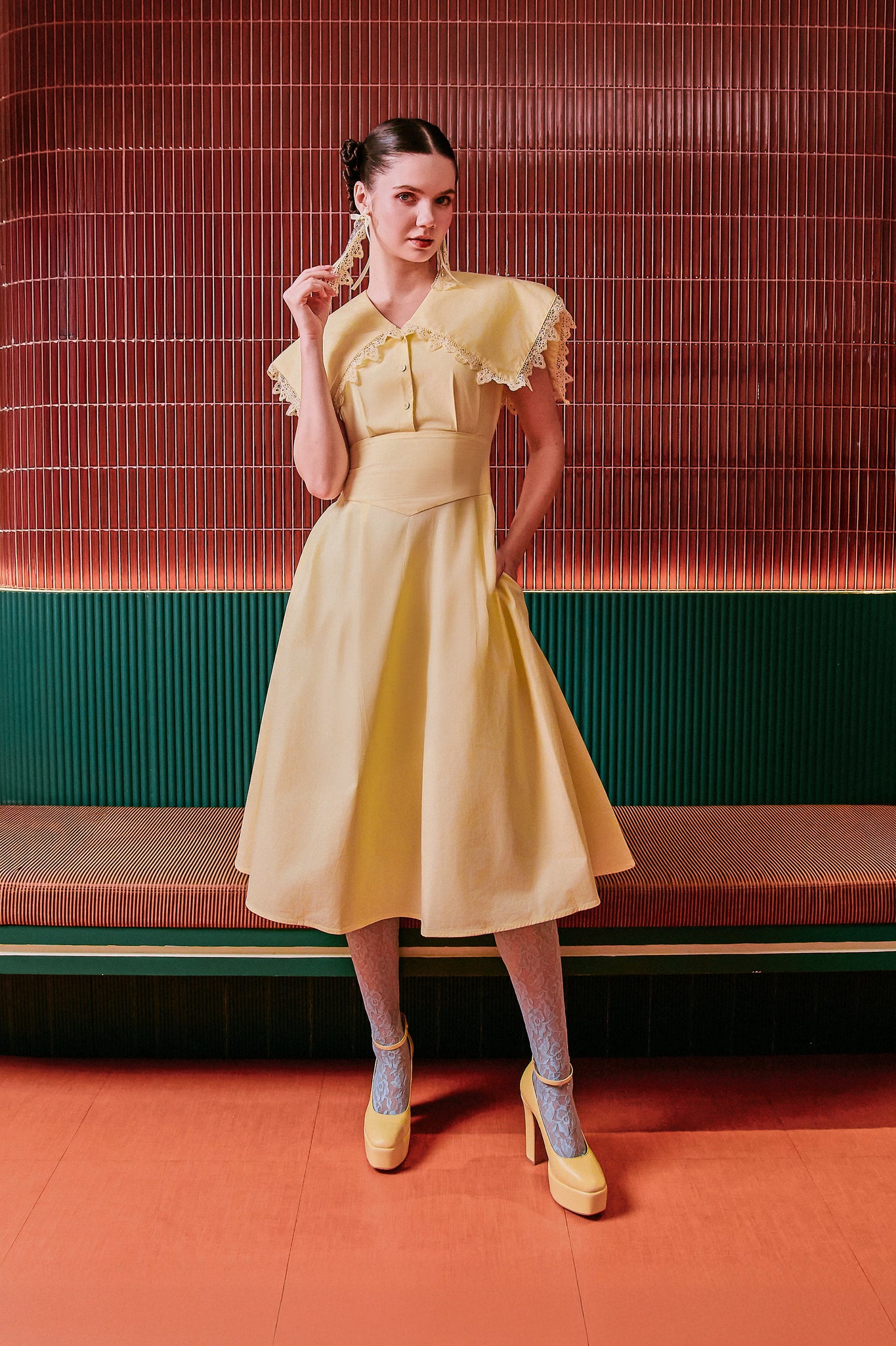 Playful yet refined, this cotton midi dress with back-zipper features an oversized collar with decorative front buttons and a princess seam at the waist that flows into a pleated midi skirt . Complete with side pockets for practicality, this dress brings a charm to your daytime wardrobe.