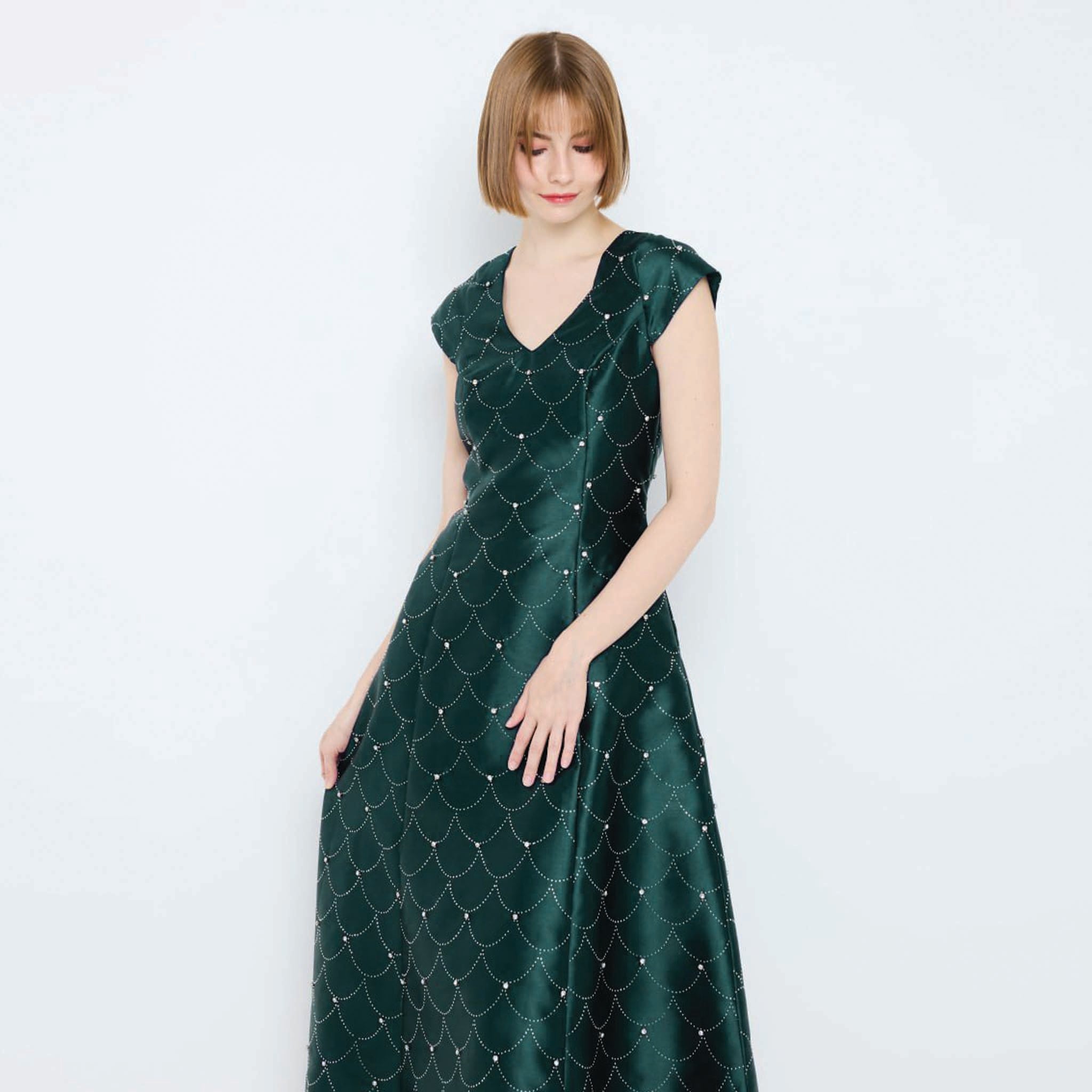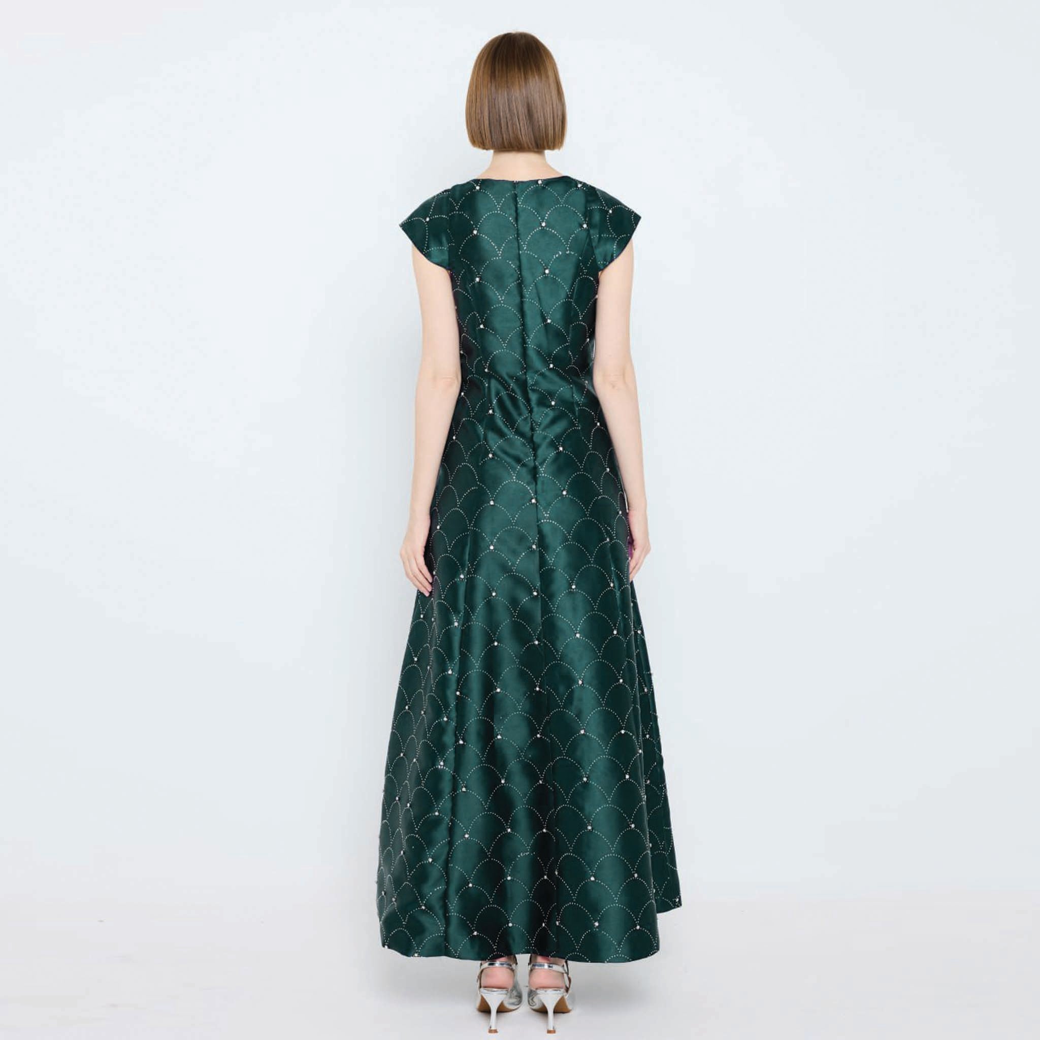 Elegant and timeless, this gown features delicate cap sleeves, a flattering V-neckline, and scalloped embellishments throughout. Finished with practical side pockets and an invisible back zipper, it blends classic glamour with effortless ease.