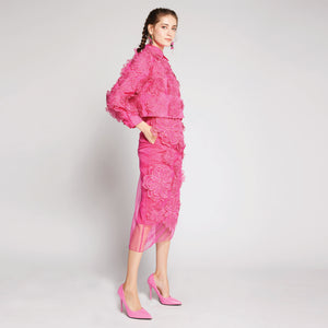This lined organza shirt features a playful design adorned with large 3D floral appliqués. With a collar, button-down front, and sheer, textured fabric, it blends whimsical charm with modern sophistication—perfect for making a bold style statement. You can pair this with our matching skirt, shorts or even with a pair of plain trousers.