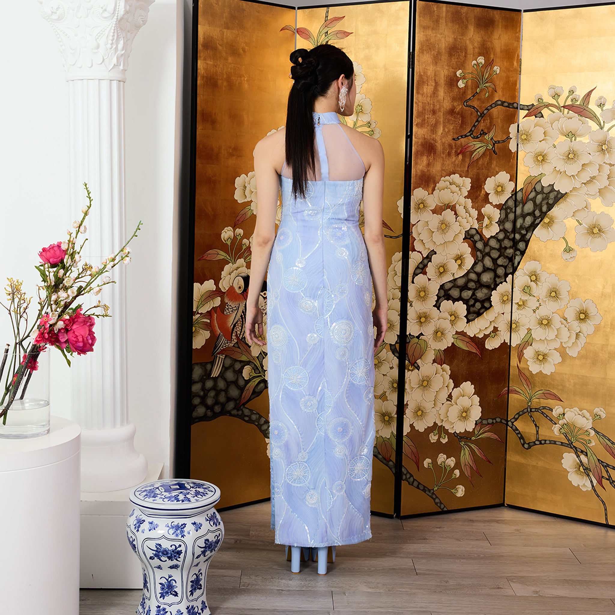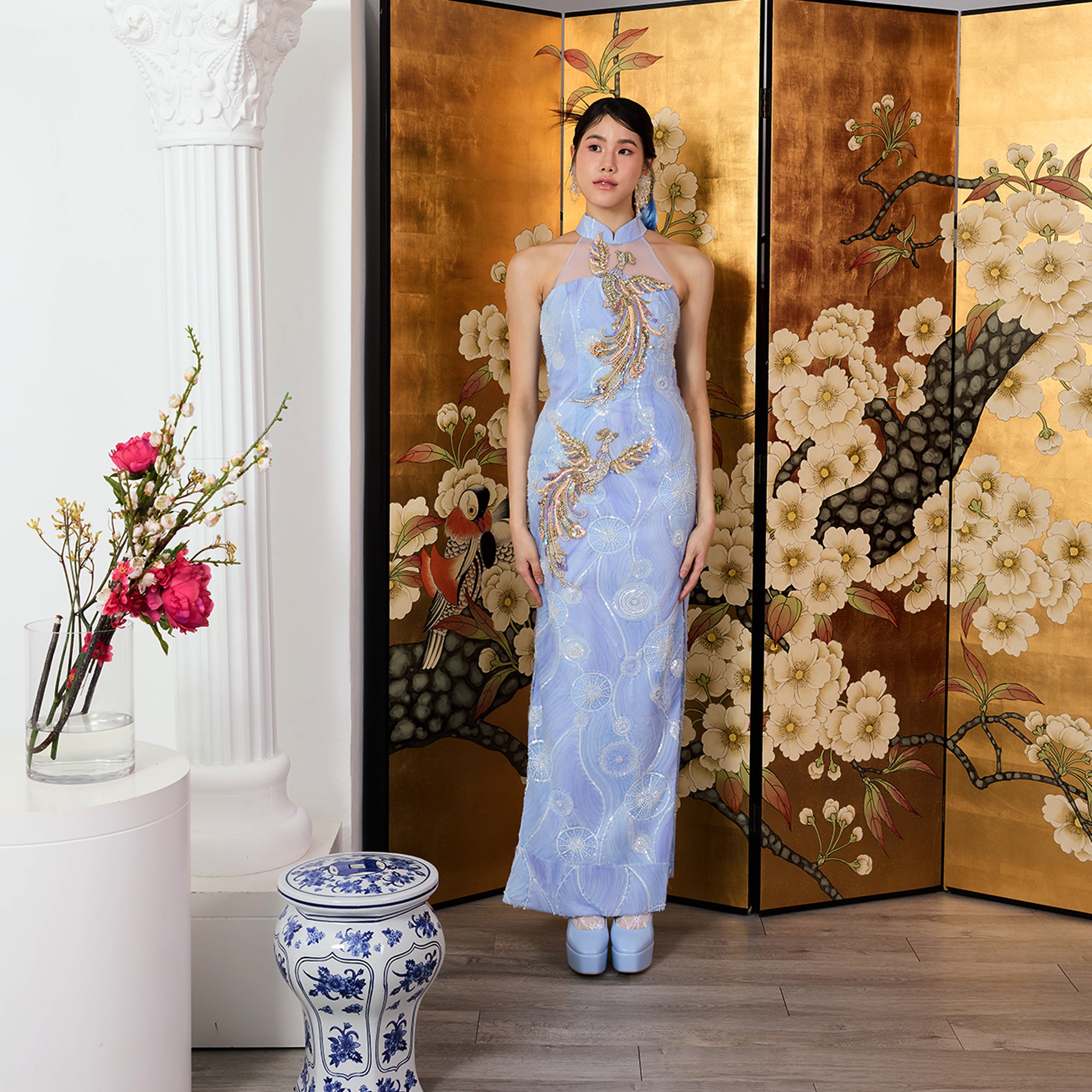 This qipao-inspired halter dress features lightweight tulle with mesmerizing swirling gradient motifs, adorned with an elegant phoenix embellishment and sparkling stones that add a touch of glamorous shimmer with every step. Its graceful silhouette, paired with a side slit, offers a modern and feminine edge, making this classic design the perfect choice to captivate at any special occasion