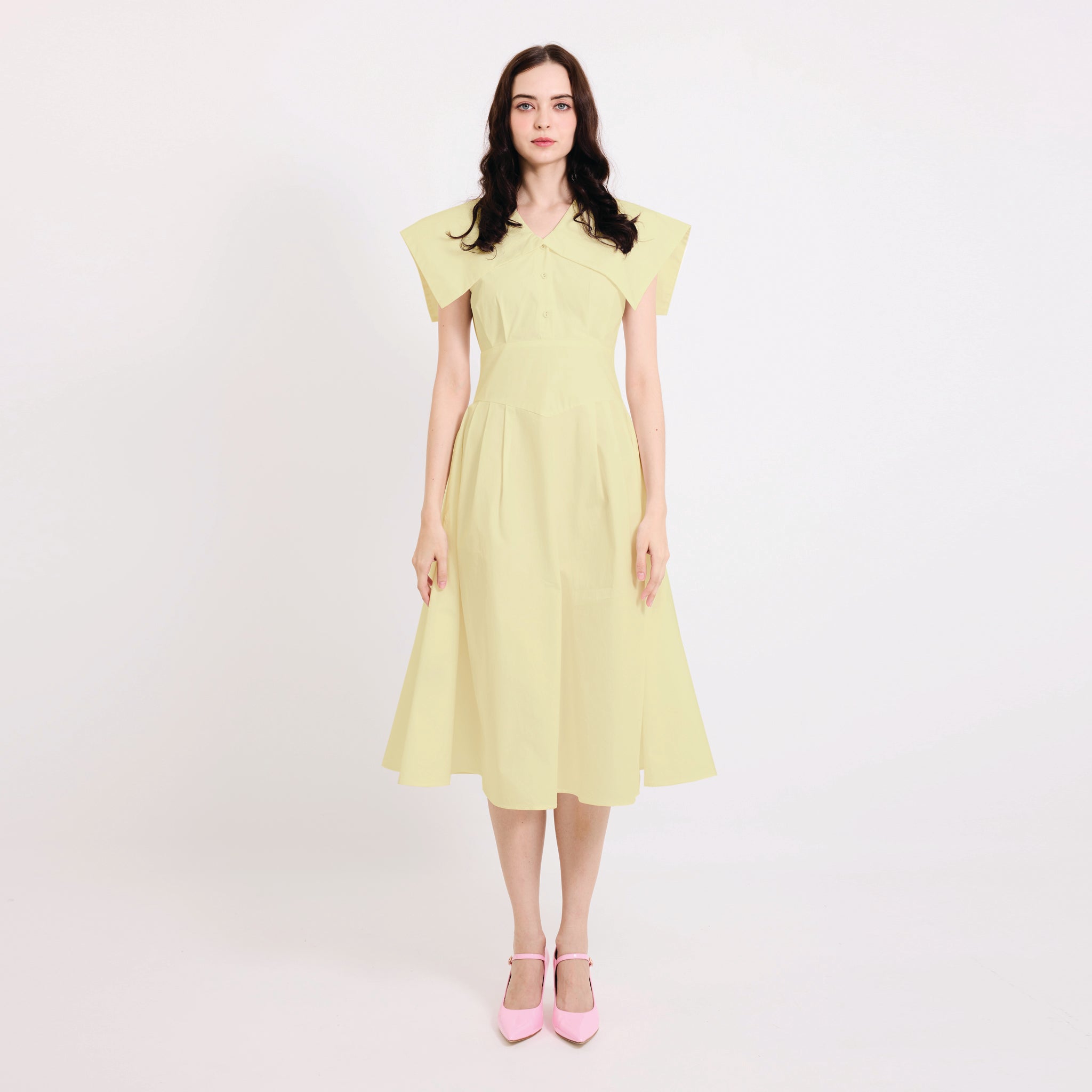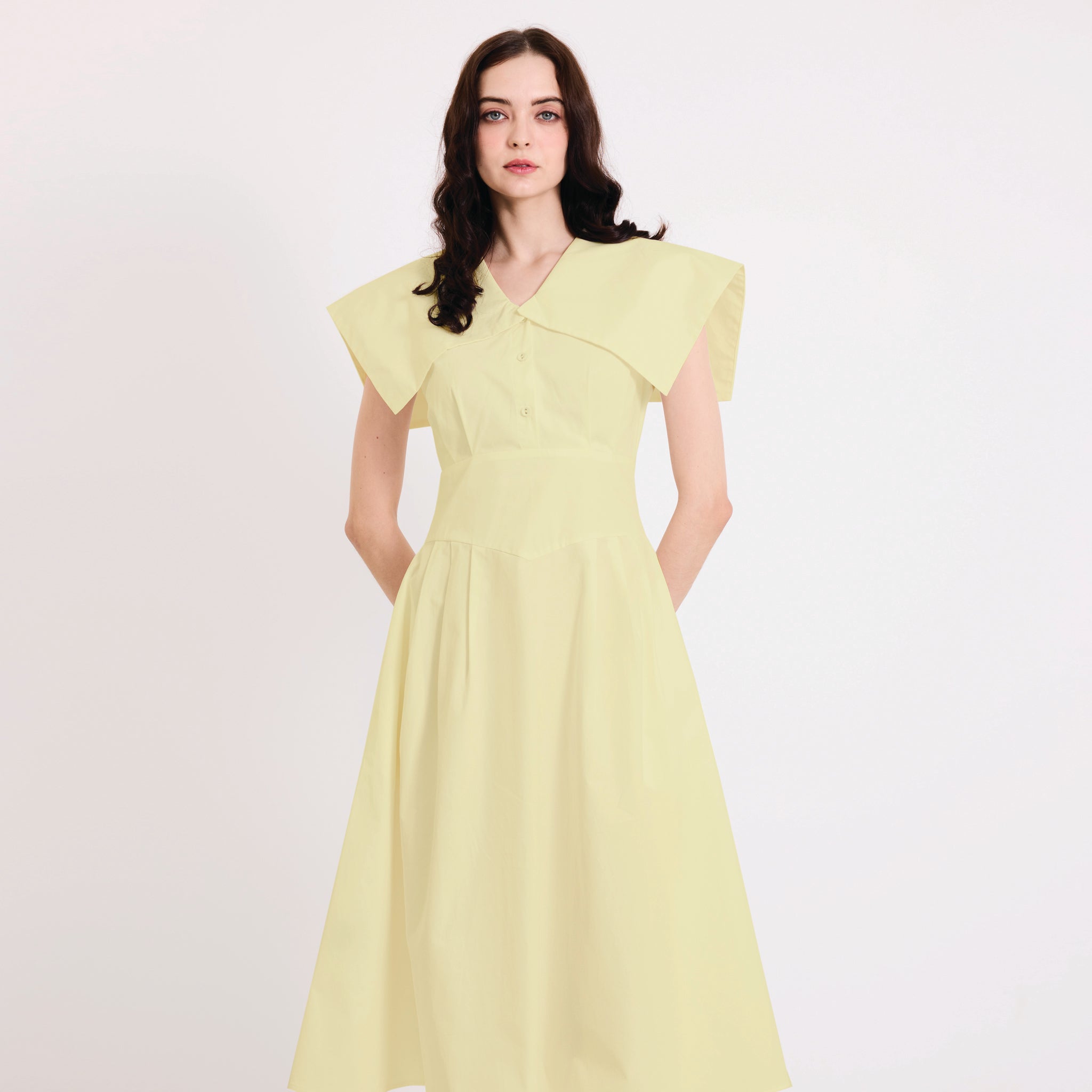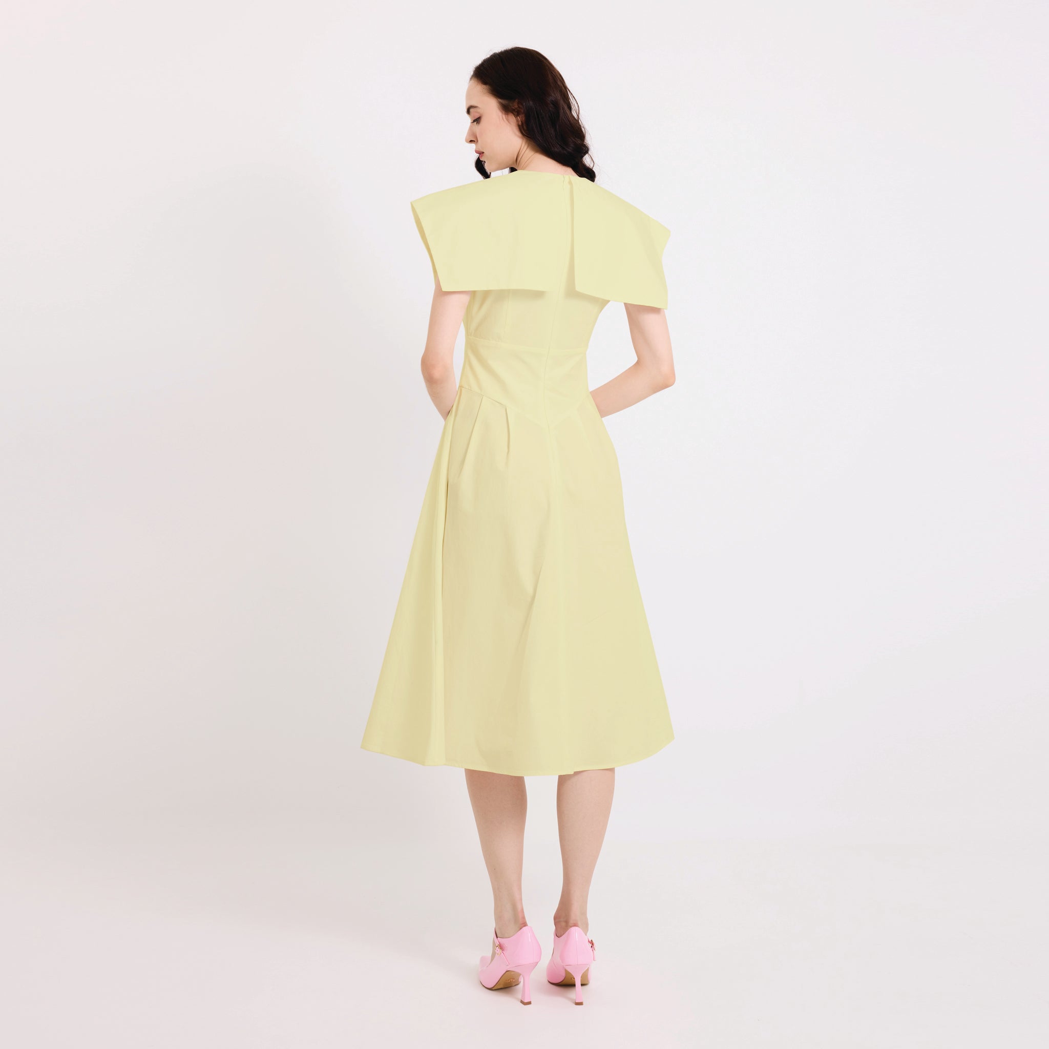 Playful yet refined, this cotton midi dress with back-zipper features an oversized collar with decorative front buttons and a princess seam at the waist that flows into a pleated midi skirt . Complete with side pockets for practicality, this dress brings a charm to your daytime wardrobe.